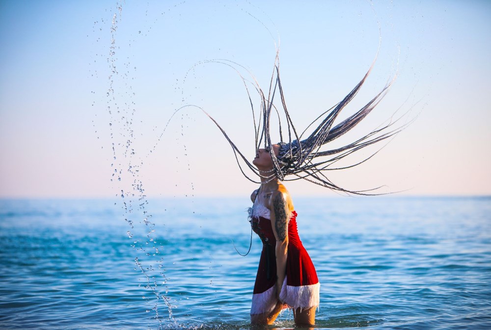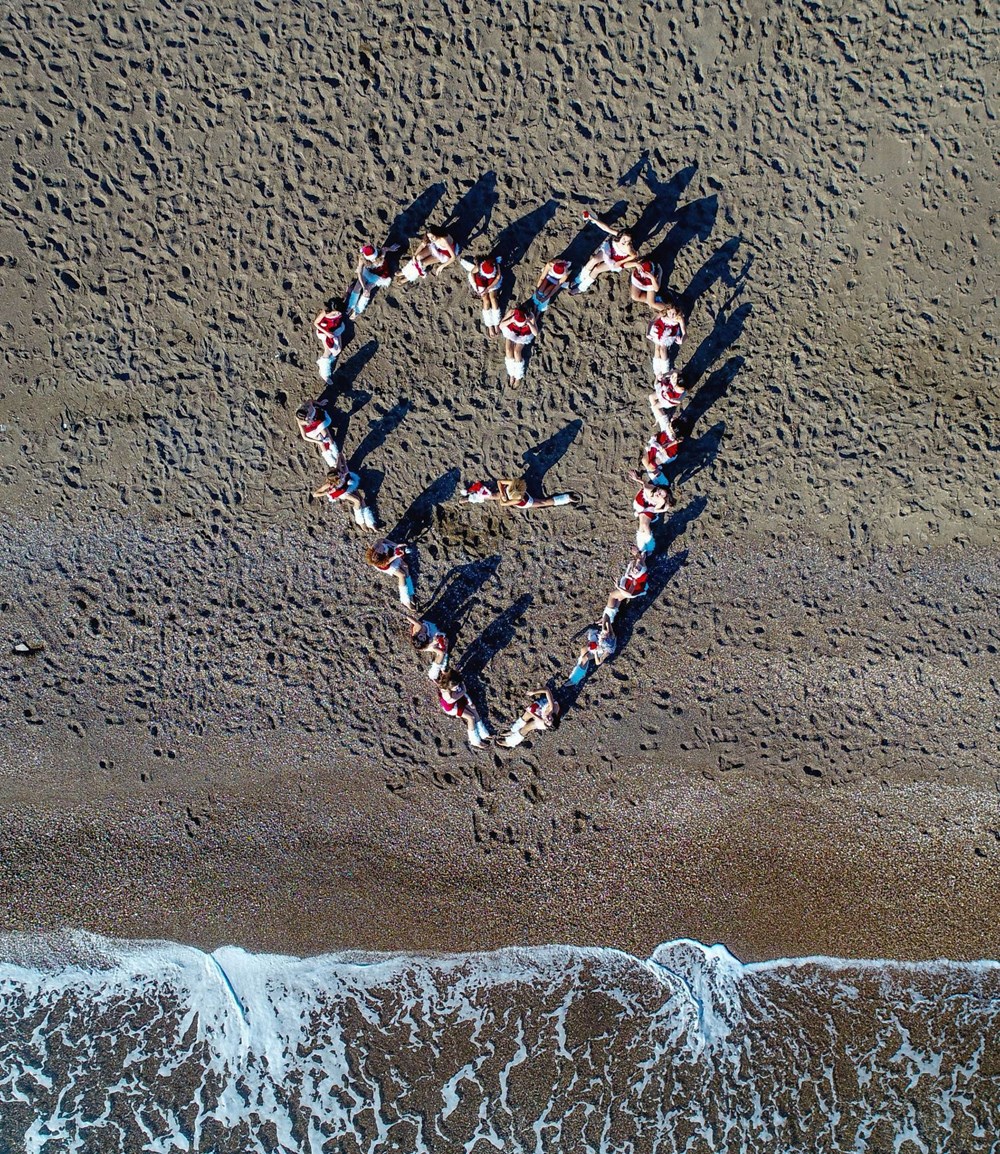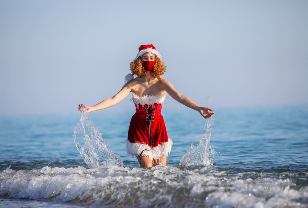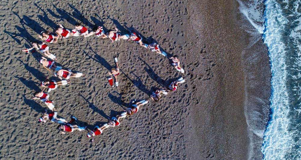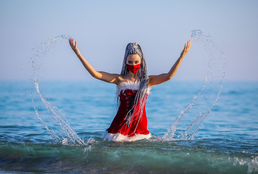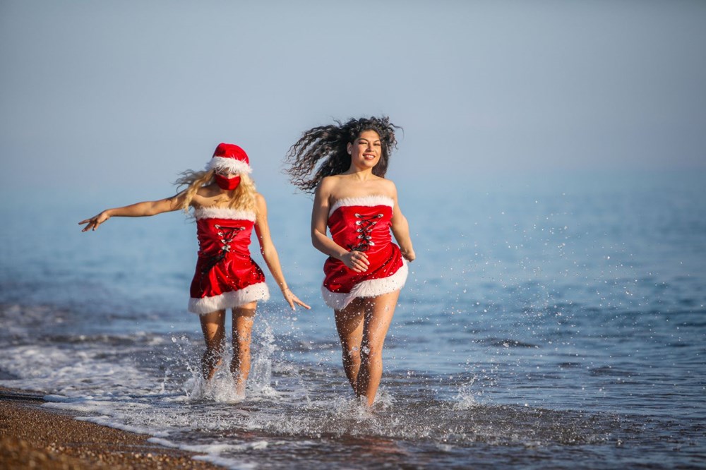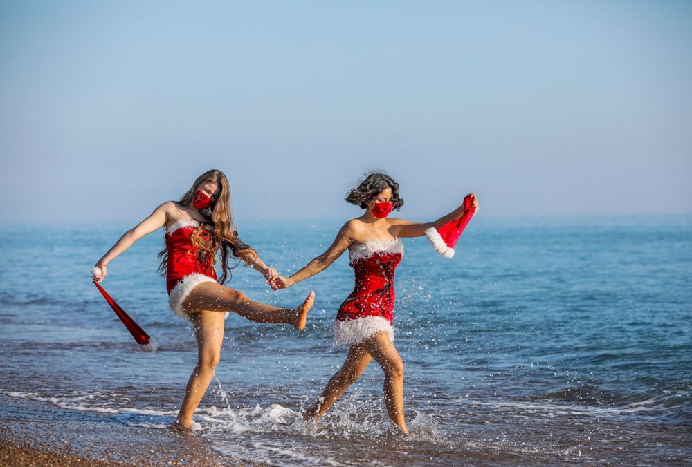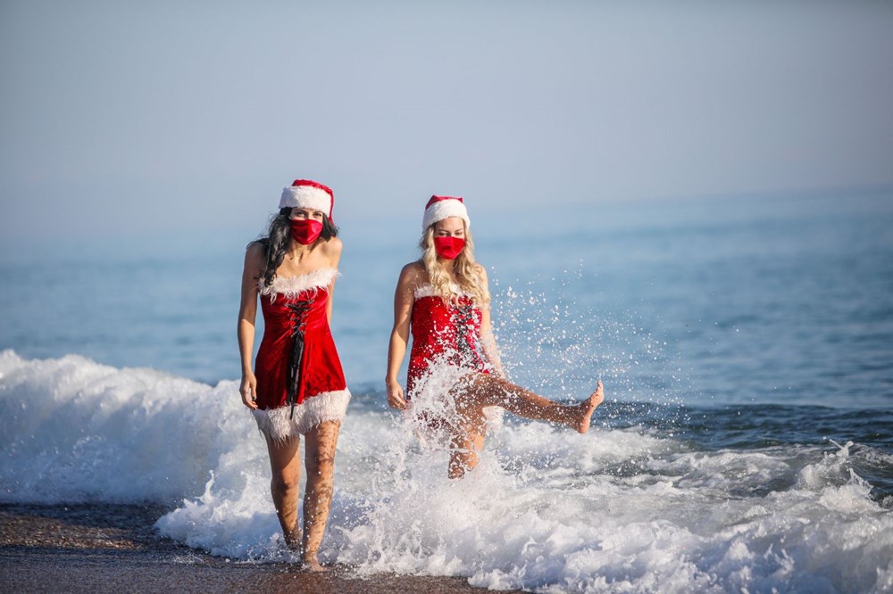 - Oluşturdukları kalp şekli ve taktıkları kırmızı maskelerle dünyaya ‘sağlık ve barış’ mesajı veren noel anneler, denize girmeyi de ihmal etmedi.