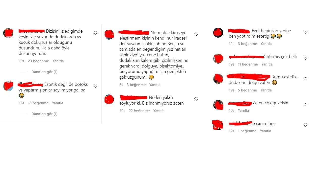 - Ben de videoya bakınca gerçekten estetik yaptırmışım gibi duruyordu, yani çok farklı bir bendi. Ama bununla ilgili bir açıklama yapma gereği duymadım çünkü ben aynı benim, bilenler biliyor. Zaten dizi çekimimin ortasında estetik operasyon geçirme ihtimalim de yok, sahnelerde bir devamlılığımız var. İhtiyacım olmadığı sürece de estetik gündemimde olan bir şey değil. “