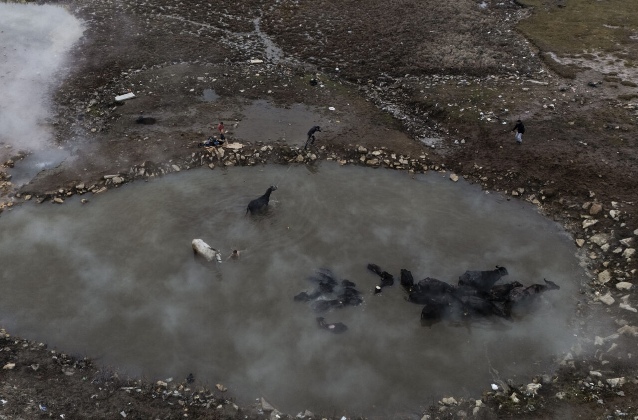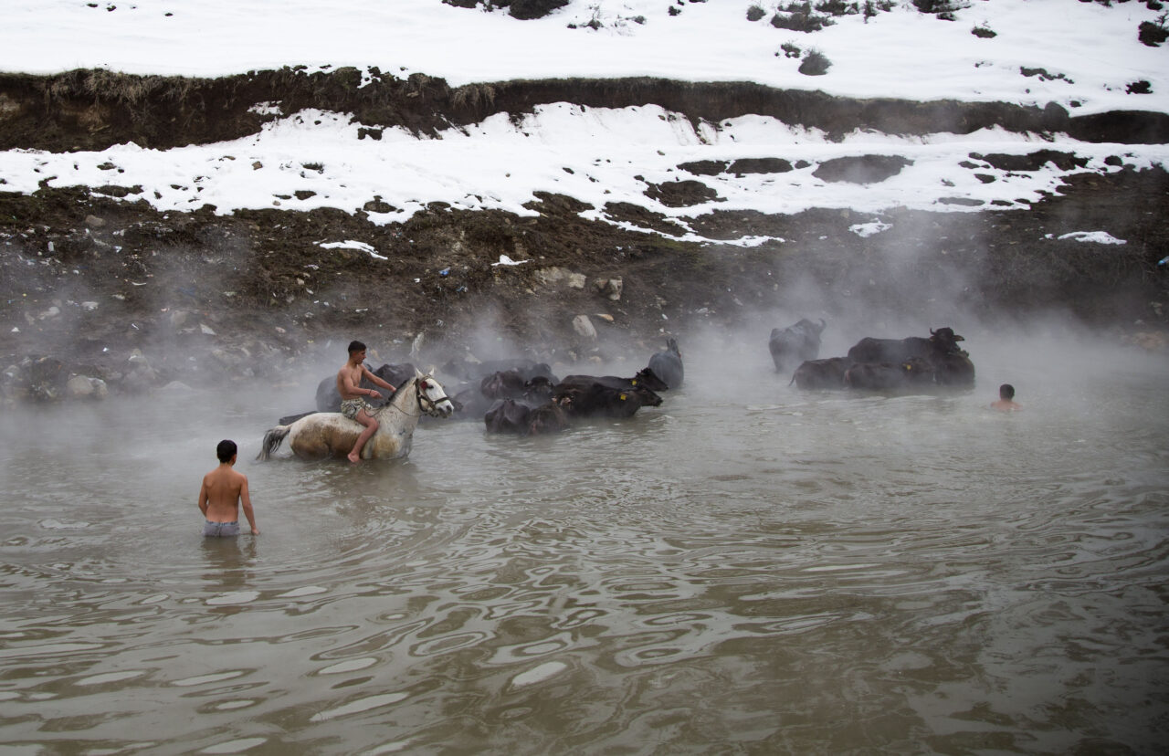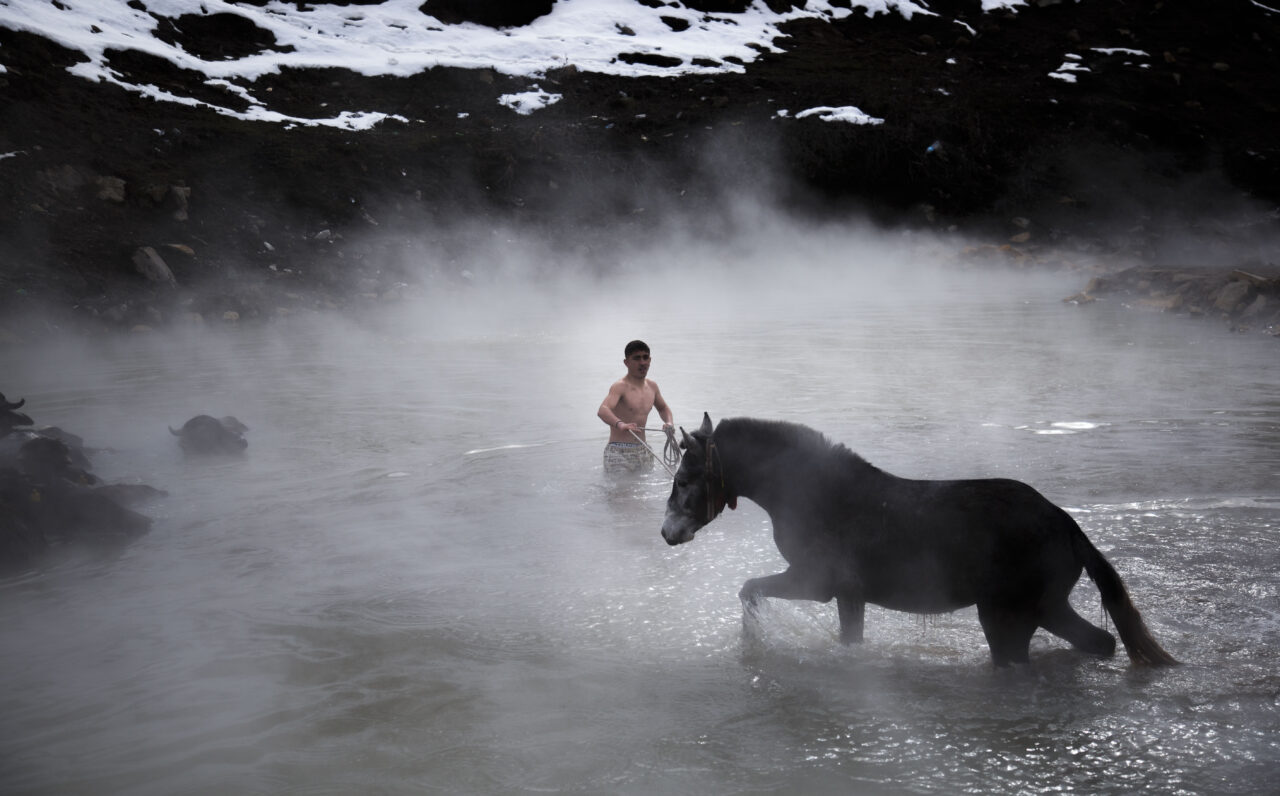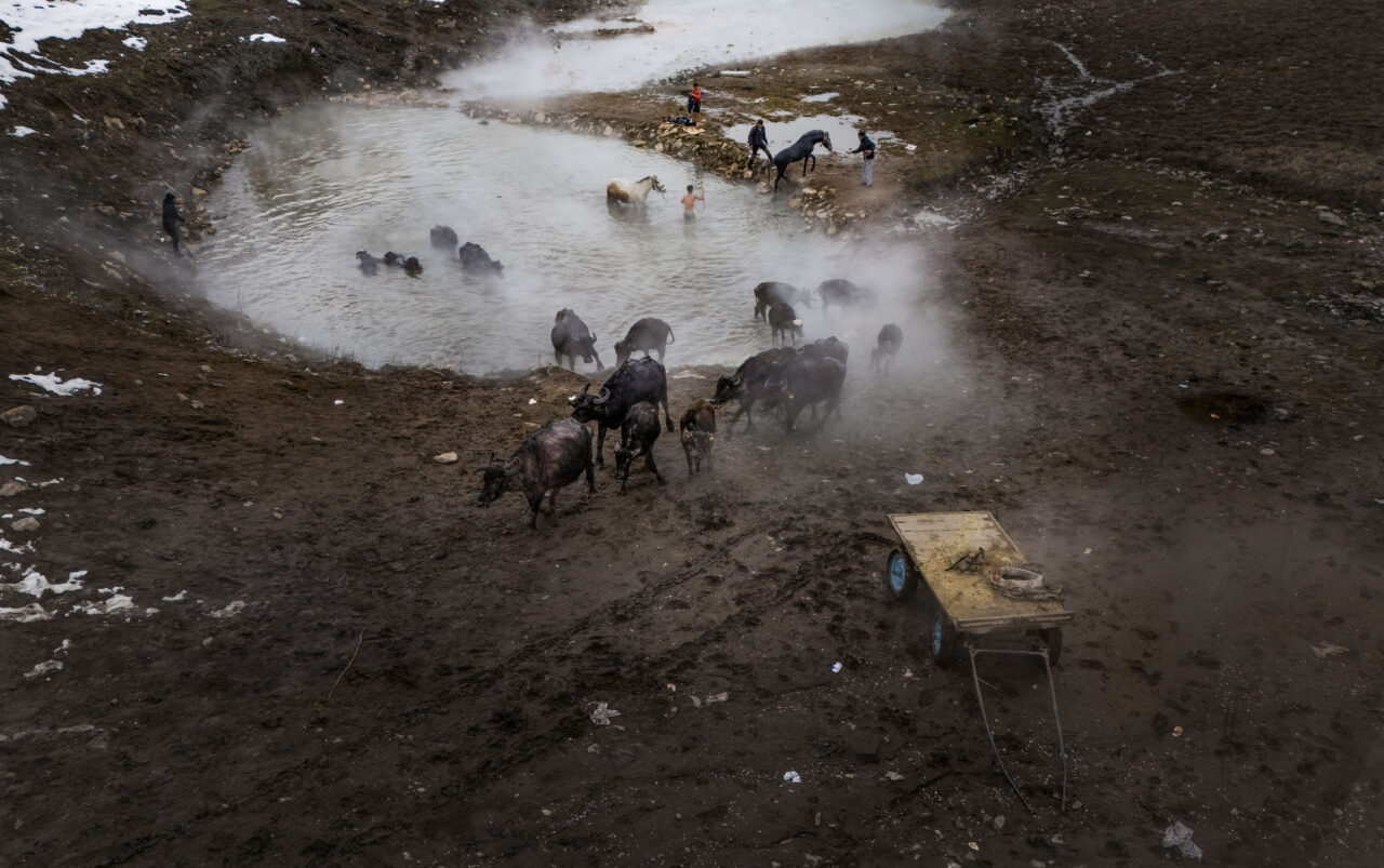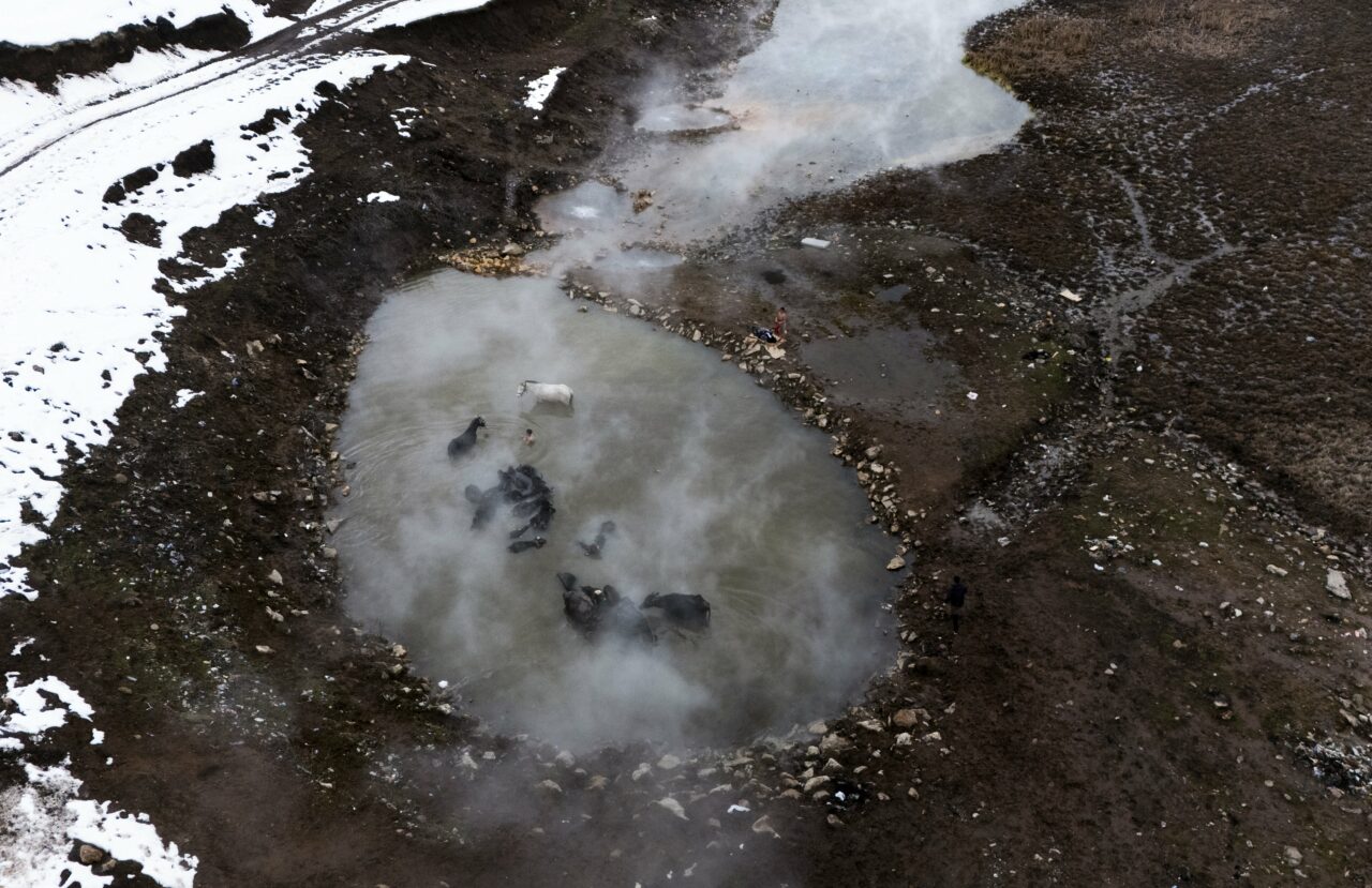 Atlar ve mandalarla kaplıca keyfi! Burası Türkiye’de nerede? Bitlis’in Güroymak ilçesine bağlı Budaklı köyünde besiciler, kış aylarında ahırlarda kalan manda ve atlarını yüksek sıcaklıktaki kaplıca suyunda yıkayarak temizliyor.