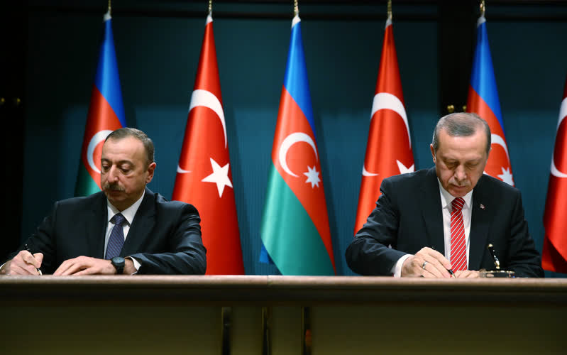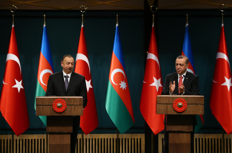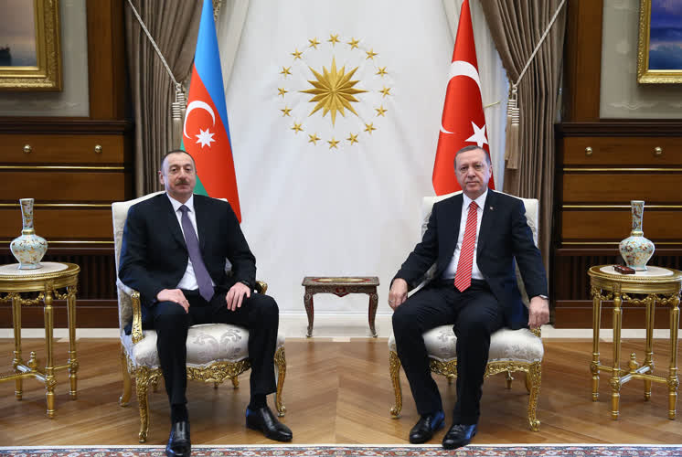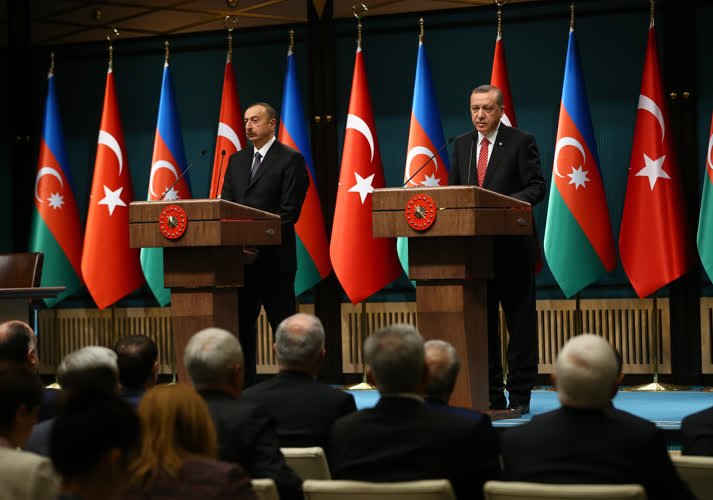 - Cumhurbaşkanı Recep Tayyip Erdoğan (sağda) ile Azerbaycan Cumhurbaşkanı İlham Aliyev (solda), görüşmelerinin ardından Cumhurbaşkanlığı Külliyesi’nde ortak basın toplantısı düzenledi.