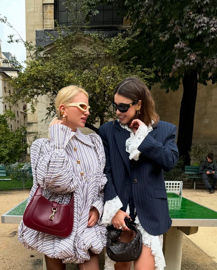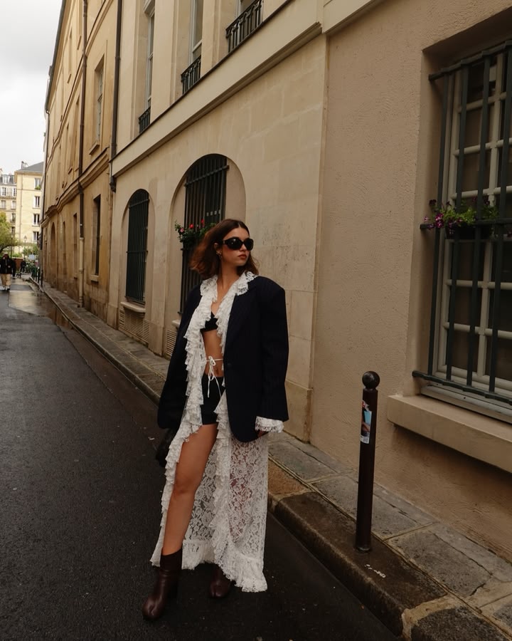 - Dantel hırkasının içine siyah kısa tayt ve siyah sütyen giyen Saraçoğlu kombinini ise oversize çizgili bir ceket ile tamamladı.