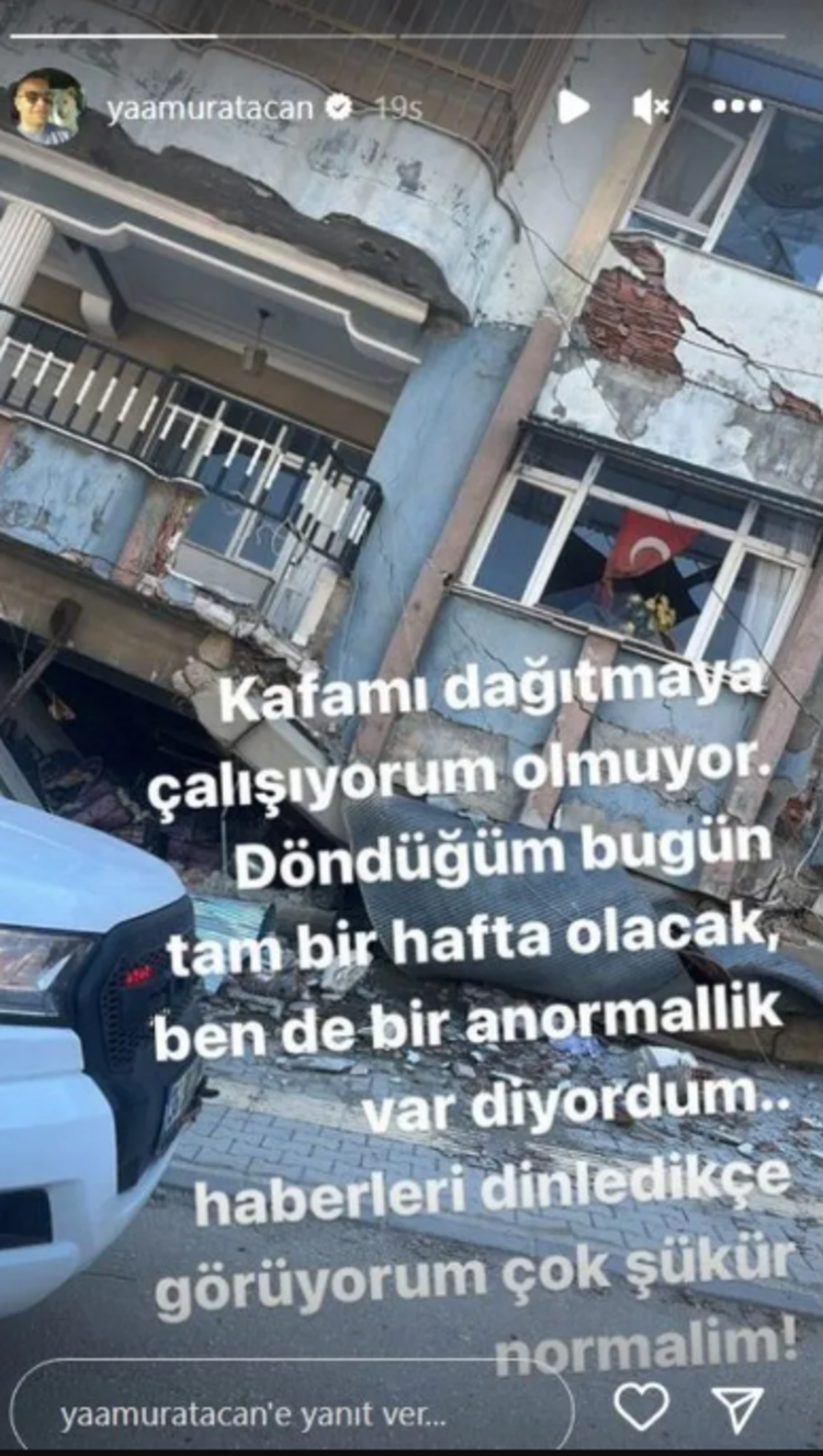 - 7.7 ve 7.6 şiddetindeki iki büyük deprem sonrası tüm Türkiye’de yardım seferberliği başladı. Depremden etkilenen bölgelere yardım göndermek için herkes seferber oldu. Oyuncu Yağmur Atacan ve arkadaşları da büyük felaketin ardından off road araçlarıyla depremden etkilenen Hatay’a yardım için gitti. Geçtiğimiz günlerde evine dönen Atacan yaptığı bir paylaşımla dikkat çekti.