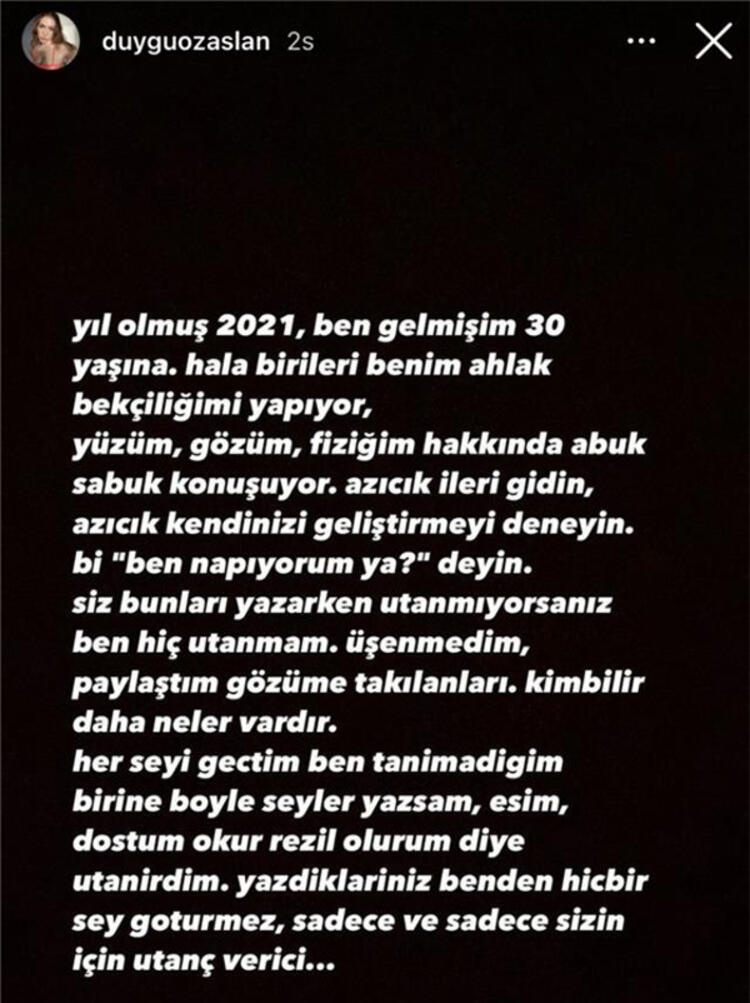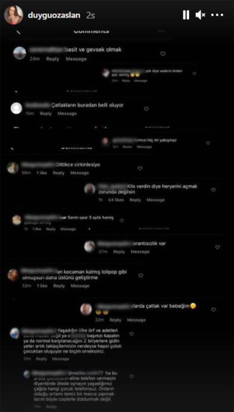 - KÖTÜ YORUMLARI İFŞA ETTİ Çok sayıda tepki mesajı alan 30 yaşındaki Özaslan, kötü yorumları sosyal medya hesabının hikaye kısmından paylaştı.