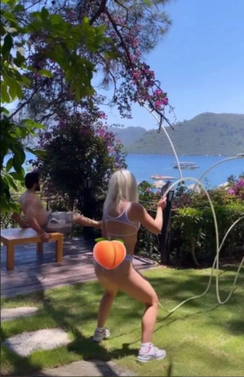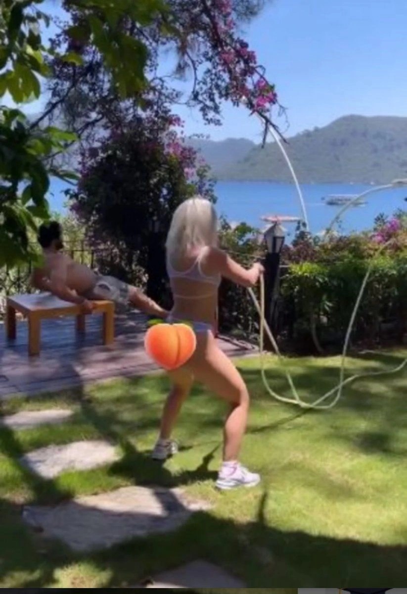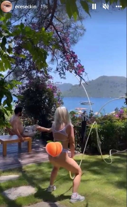 - Bikinisiyle bahçede spor yapan Ece Seçkin kalçalarını şeftali emojisiyle sansürlemeyi tercih etti.