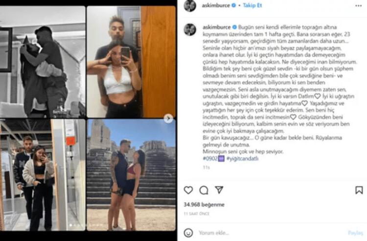 - ‘RÜYALARIMA GELMEYİ UNUTMA’ Aşkım Burçe, “Seni asla unutmayacağım diyemem zaten sen, unutulacak gibi biri değilsin. İyi ki varsın Datlım. İyi ki uğraştın uğraştın, vazgeçmedin ve girdin hayatıma. Yaşadığımız ve yaşattığın her şey için çok teşekkür ederim” dedi ve ekledi: Sen beni hiç incitmedin, toprak da seni incitmesin. Gökyüzünden beni izleyeceğini biliyorum, kalbim senin evin ve söz veriyorum ben evine çok iyi bakmaya çalışacağım. Bir gün kavuşacağız… O güne kadar bekle beni. Rüyalarıma gelmeyi de unutma. Minnoşun seni çok ve hep seviyor.(Posta)