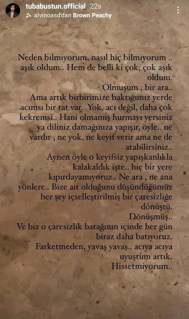 - Yakın tarihte işletmeci Umut Evirgen ile 3 yıllık ilişkisini bitiren Tuba Büyüküstün yaptığı paylaşımla akılları karıştırdı. Son dönemde kimseyle yan yana görünmeyen Büyüküstün, 2011 yılında da Onur Saylak ile evlenmiş ve 2017 yılında ayrılmışlardı. Türkiye’nin yanı sıra dünyanın dört bir yanında tanınan güzel oyuncu, paylaşımı ile ‘kime aşık oldu?’ sorusunu akıllara getirdi.