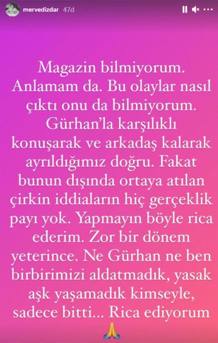 - ‘YASAK AŞK YAŞAMADIK’ “Fakat bunun dışında ortaya atılan çirkin iddiaların hiç gerçeklik payı yok. Yapmayın böyle rica ederim. Ne Gürhan, ne ben birbirimizi aldatmadık. Yasak aşk yaşamadık kimseyle. Sadece bitti. Rica ediyorum.” diye yazmıştı.