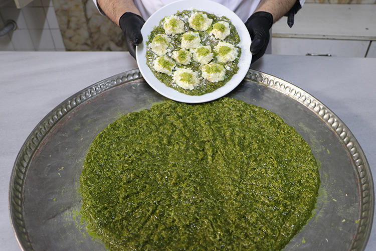 - Çiğ kadayıfın yağla kavrulduktan sonra ocaktaki tepsiye yerleştirilerek 5 dakika ısıtıldığını aktaran Bekan, “Tepsiye toz şeker, fıstık ve tereyağı ilave ediyoruz. Yaklaşık 10-15 dakika pişirildikten sonra kıvamlı hale gelinceye kadar karmalarız. Daha sonra tepsiye açıp üzerine Kilis’e özgü kaymak, pudra şekeri, tarçın ve fıstık ilave ederek servise hazır hale getiriyoruz.” dedi.