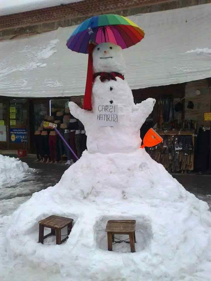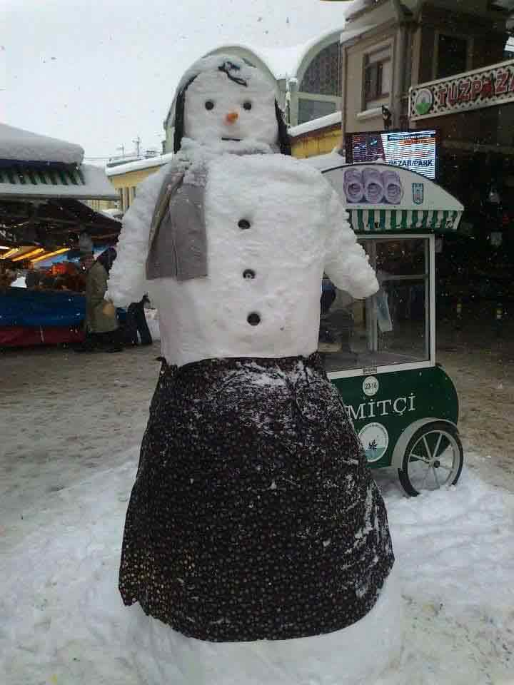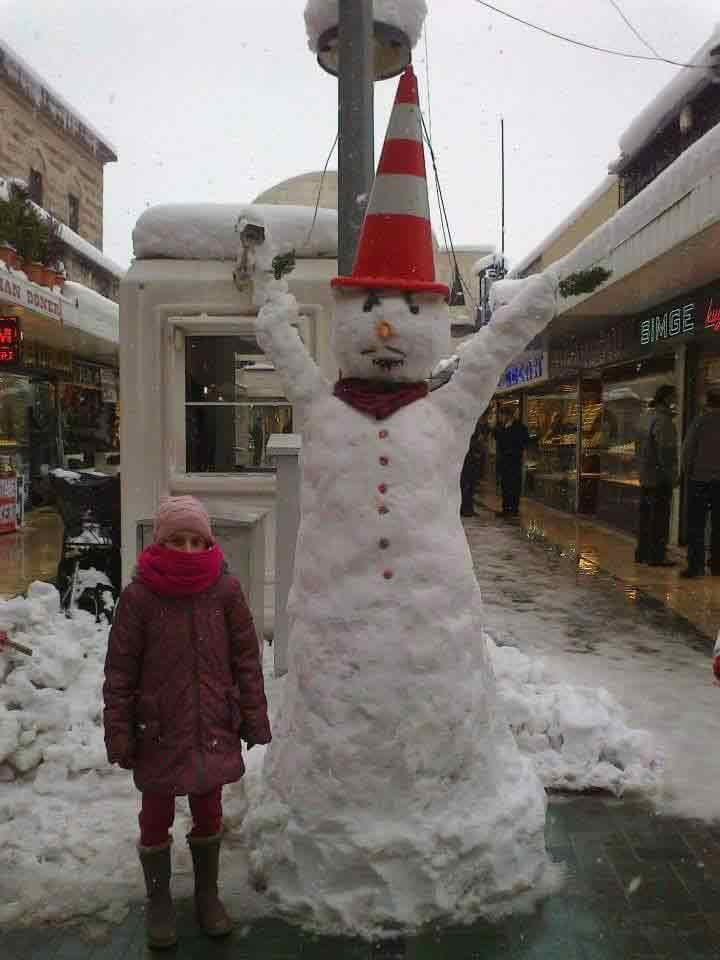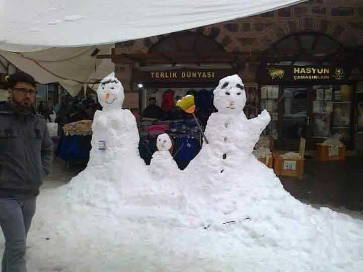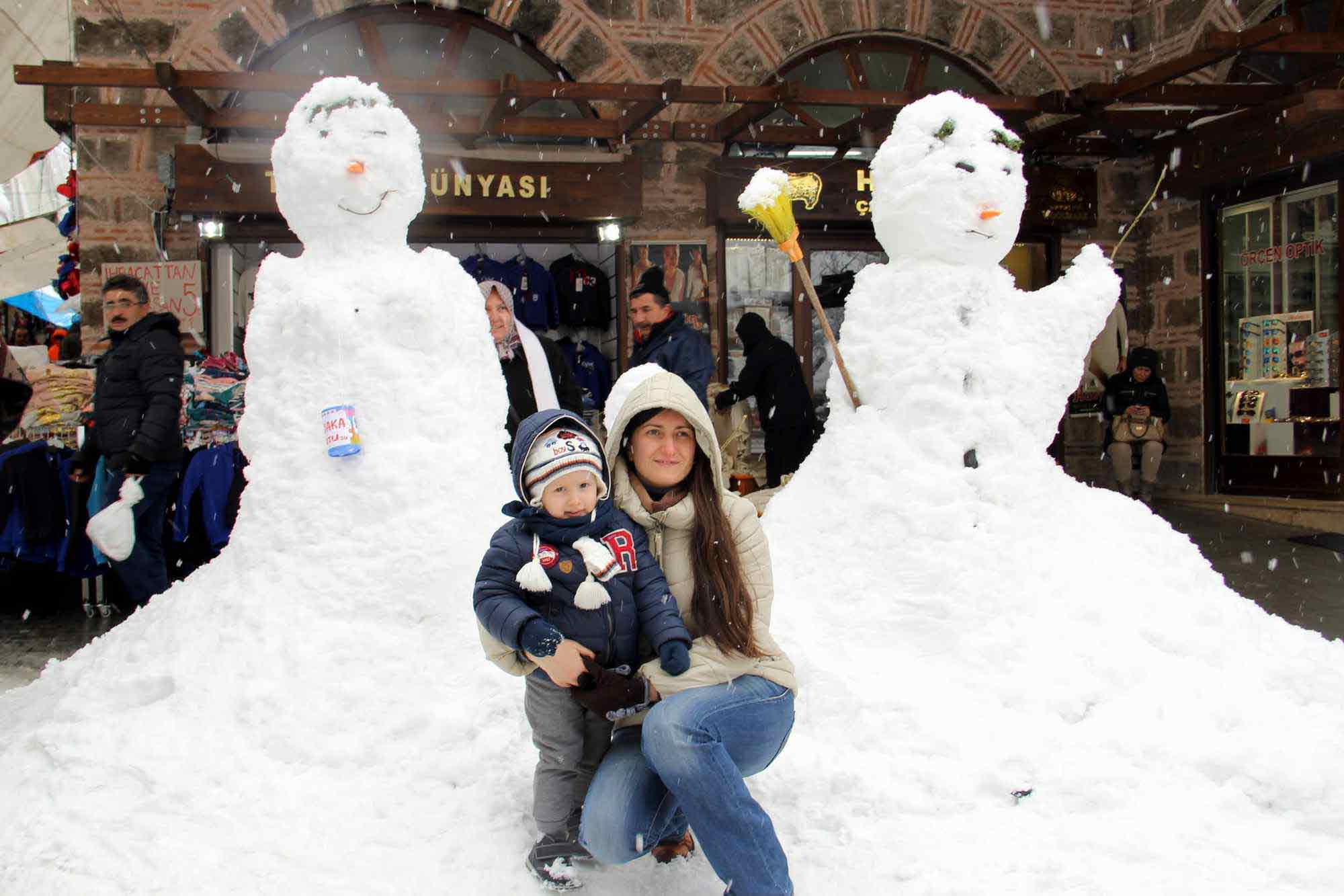 Türkiye’yi etkisi altına alan yoğun kar yağışı ortaya renkli görüntüler çıkarıyor. Kapalıçarşı adeta kardan adam sergisine döndü.