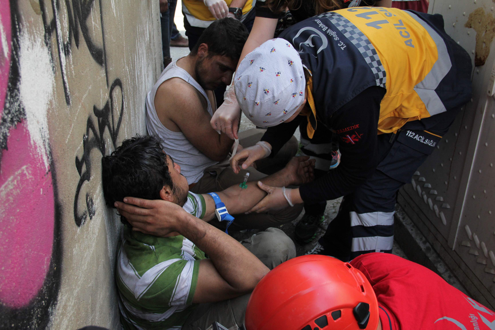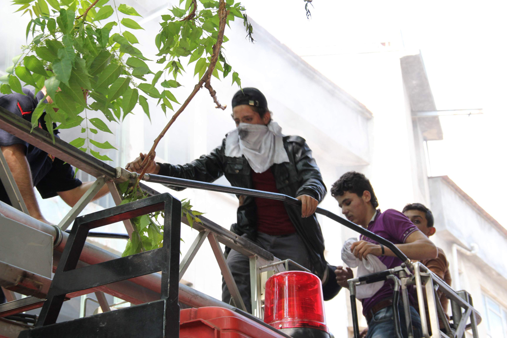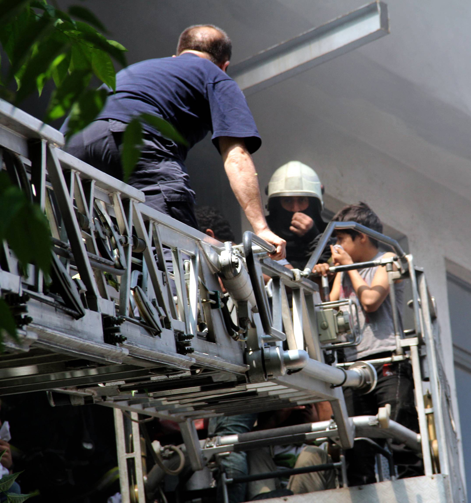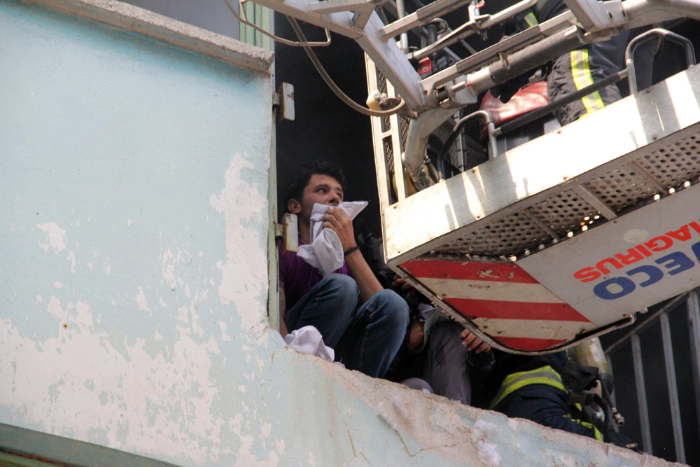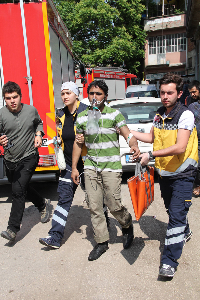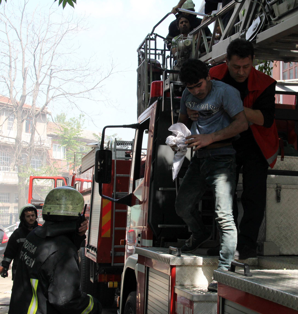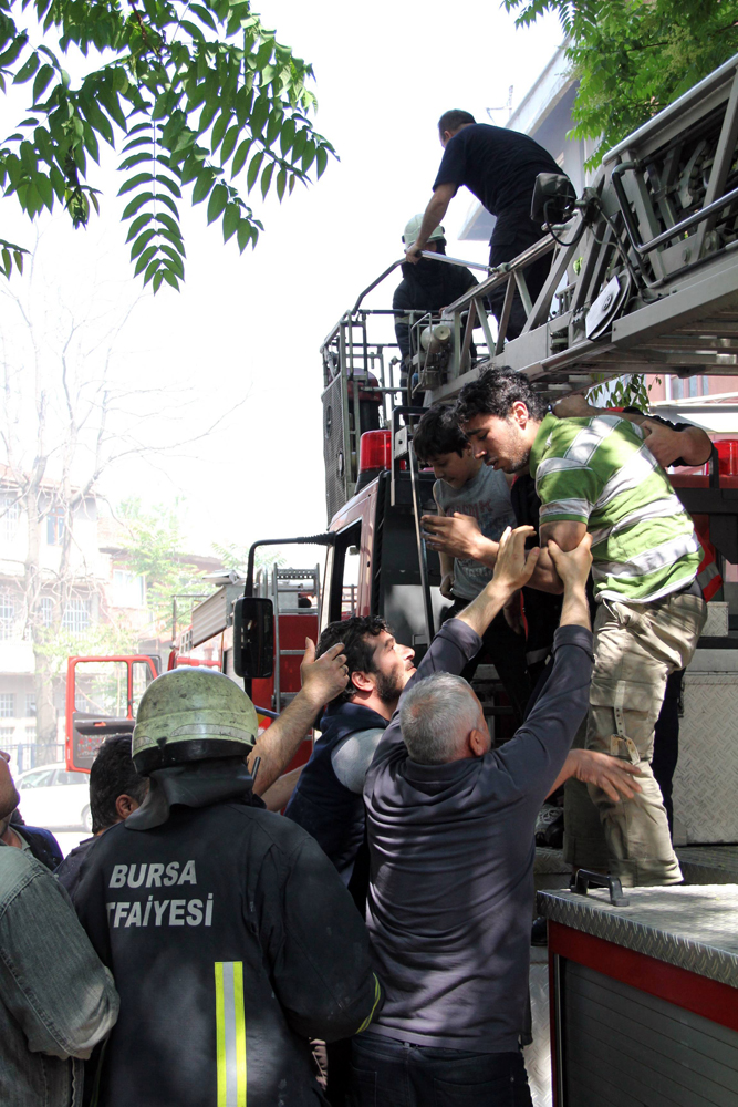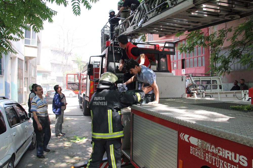 Bursa’da bir iş yerinin zemin katında Suriyelilerin yemek pişirdiği sırada yangın çıktı. Birinci katta bulunan Suriyeliler, binanın dumanla kaplanması üzerine binada mahsur kalınca, itfaiyenin merdivenli aracıyla kurtarıldı.