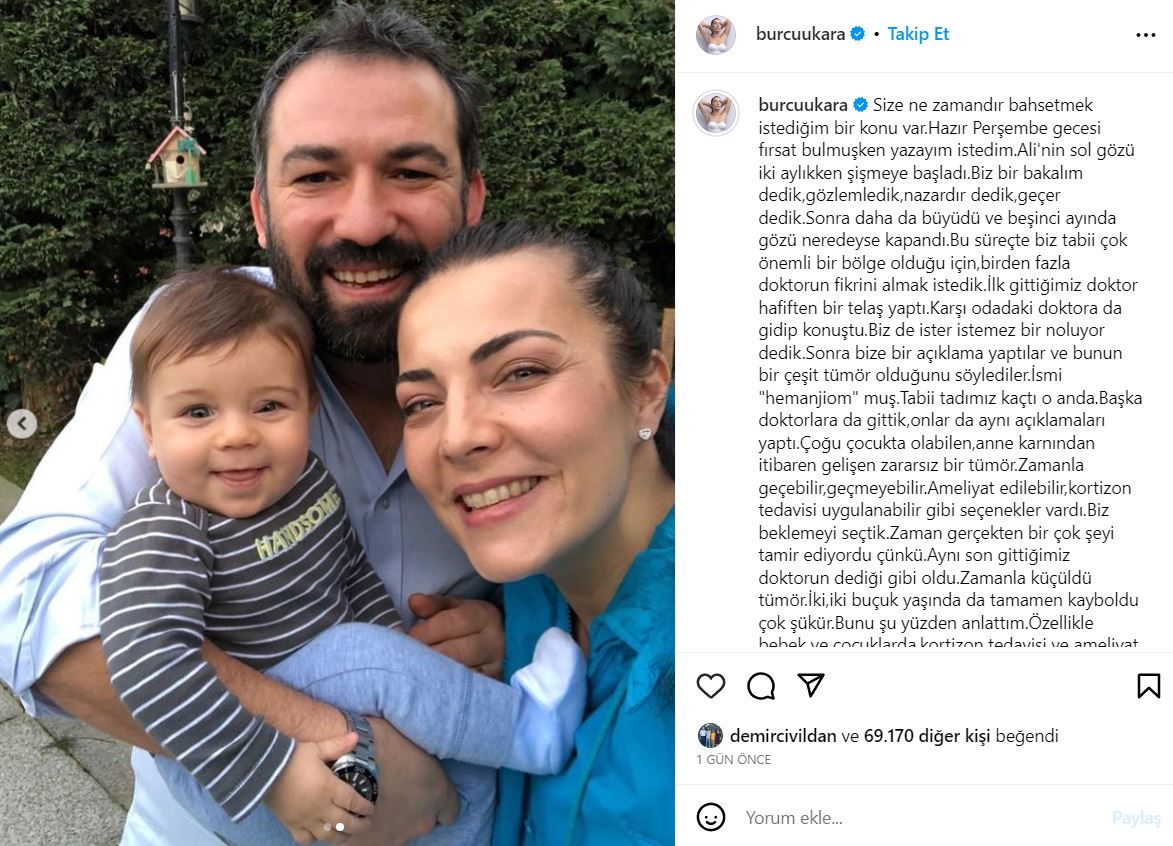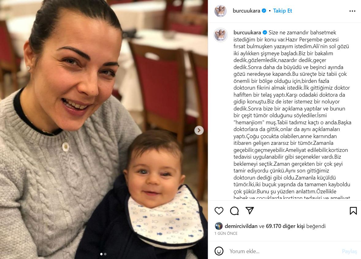 - Burcu Kara, “Size ne zamandır bahsetmek istediğim bir konu var. Hazır perşembe gecesi fırsat bulmuşken yazayım istedim. Ali’nin sol gözü iki aylıkken şişmeye başladı. Biz ‘Bir bakalım’ dedik, gözlemledik, ‘Nazardır’ dedik, ‘Geçer’ dedik. Sonra daha da büyüdü ve beşinci ayında gözü neredeyse kapandı. Bu süreçte biz tabii çok önemli bir bölge olduğu için, birden fazla doktorun fikrini almak istedik. İlk gittiğimiz doktor hafiften bir telaş yaptı. Karşı odadaki doktora da gidip konuştu. Biz de ister istemez bir ‘Ne oluyor?’ dedik” ifadelerini kullandı.