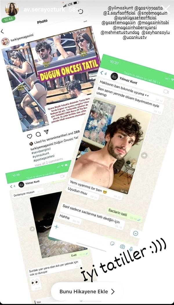 - Rol aldığı dizilerdeki başarılı performansıyla adından sık sık söz ettiren 27 yaşındaki oyuncu Sevda Erginci, bir süredir Yılmaz Kunt ile aşk yaşıyor. Sevda Erginci ile ilişkisinin evlilik yolunda olduğu konuşulan Yılmaz Kunt, son olarak flaş bir haberle gündeme geldi. Kunt’un, Seray Öztürk adlı bir avukata attığı mesajlar ifşa oldu. Yılmaz Kunt’tan kendisine gelen tüm mesajları Instagram hesabından paylaşan Seray Öztürk, “Evlilik yolundayken benimle buluşmaya çalışıyorsun” diyerek sitemini dile getirdi.