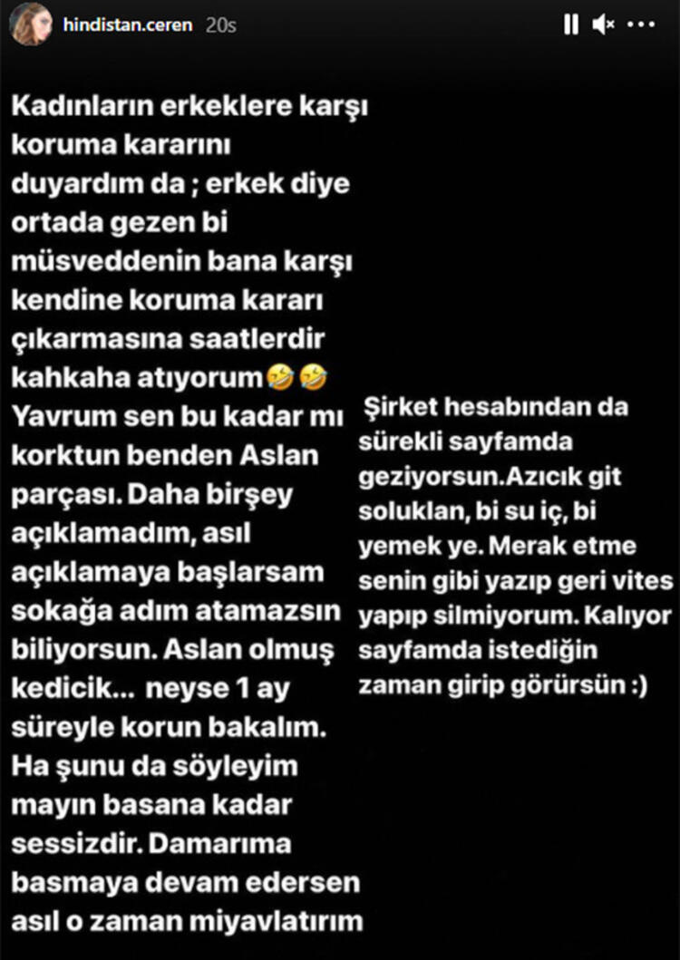 - Ceren Hindistan, Aile Mahkemesi’ne başvurarak kendisi hakkında bir ay süreyle koruma kararı ve konuşmama yasağı aldıran Ümit Aslan’a tepki gösterdi.