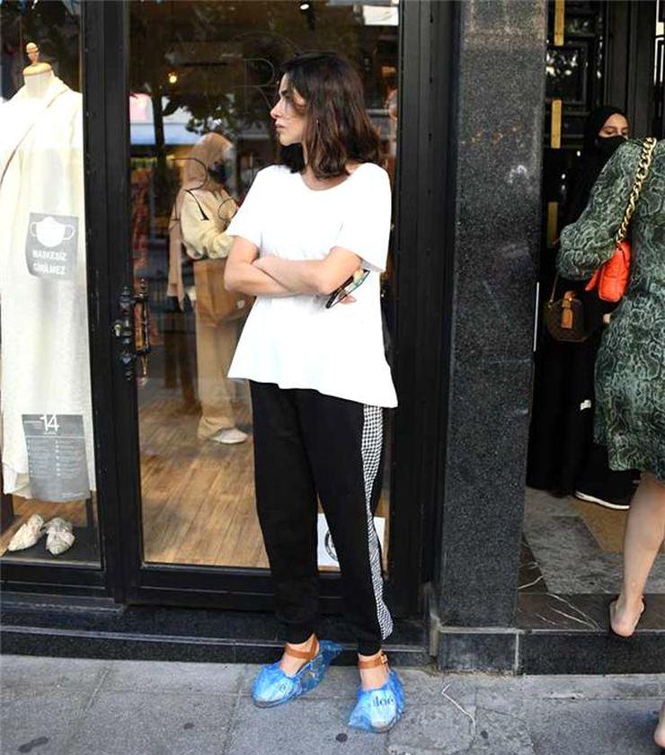 - Cep telefonuyla görüştüğü sırada maskesiz ve makyajsız olarak görüntülenen oyuncu, objektifleri fark edince binaya girmek istedi.