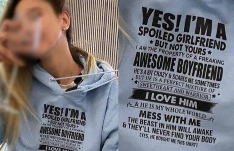 - Giysinin üzerinde, “Evet, ben şımarık bir kız arkadaşım ama senin değil. Ben korkunç derecede harika olan erkek arkadaşımın malıyım. Biraz çılgın ve bazen beni korkutuyor ama kendisi tatlılığın ve savaşçılığın mükemmel bir karışımı. Onu seviyorum ve o benim bütün dünyam. Benimle uğraşırsan, onun içindeki canavar uyanır ve seni asla bulamazlar” yazıyordu.