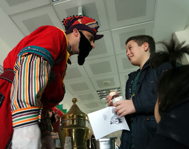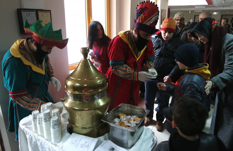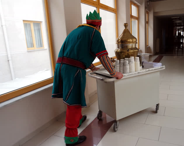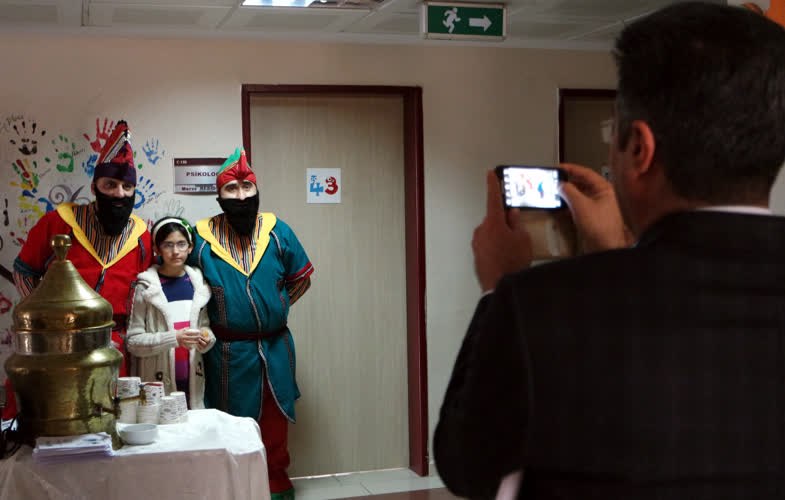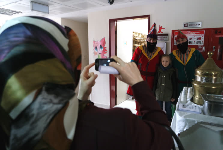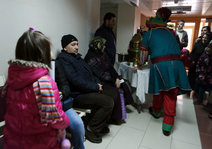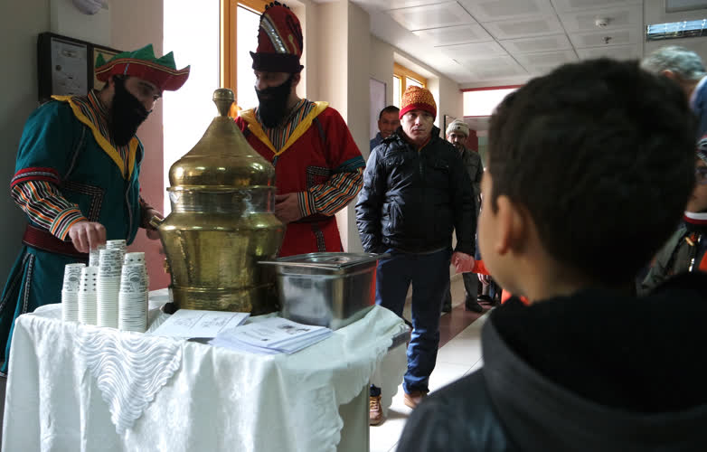 Bursa’da, Dörtçelik Çocuk Hastanesi ‘nde, Hacivat ve Karagöz kostümü giyen personel, hastane fobisini yenmek ve kentin kültürel değerlerini tanıtmak amacıyla polikliniklerde sıra bekleyen çocuklara salep ile çevre bilinci aşılayan boyama broşürleri dağıtı
