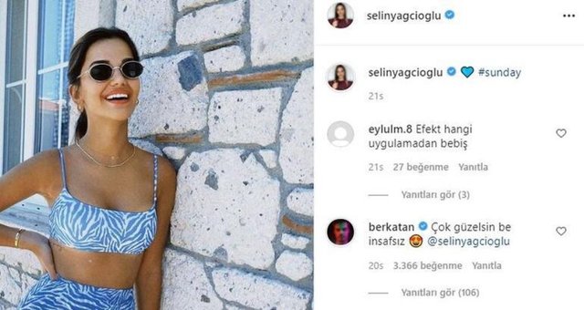 - Berk Atan, Selin Yağcıoğlu’na “Çok güzelsin be insafsız!” yorumunu yaparken Yağcıoğlu kalp emojisiyle cevap verdi.