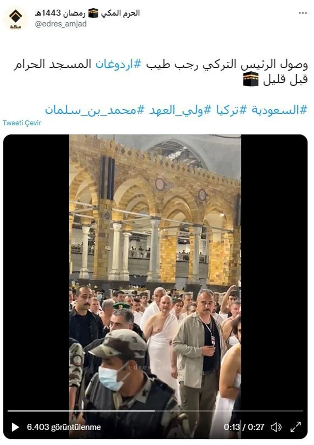 - Suudi Arabistan Kralı Selman bin Abdülaziz el-Suud’un daveti ile yaklaşık 5 yıl sonra Suudi Arabistan’a giden Cumhurbaşkanı Recep Tayyip Erdoğan, Kabe’ye umre ziyareti yaptı. AK Partili İstanbul Esenler Belediye Başkanı Mehmet Tevfik Göksu da Twitter’dan Cumhurbaşkanı Erdoğan’ın umre ziyaretinin fotoğrafını paylaştı.