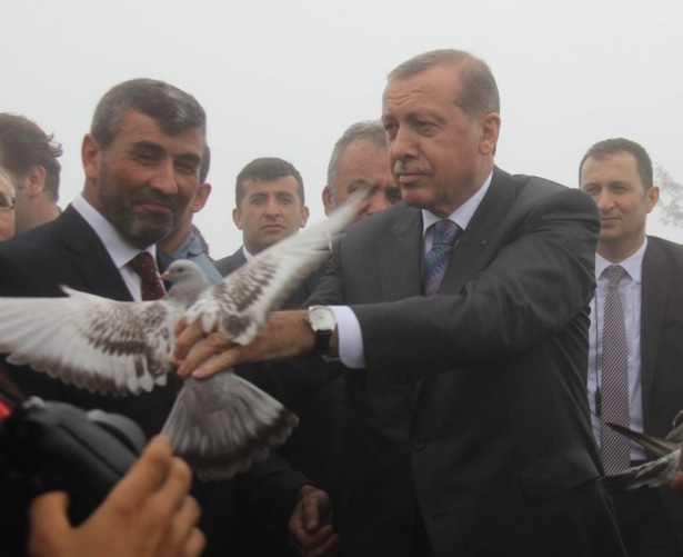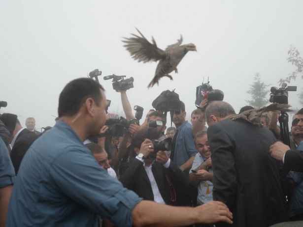 - Burada Orman Bakanlığı’nın yetiştirdiği keklikleri doğaya salmak isteyen Erdoğan’ın başına uçan kekliklerden biri kondu.