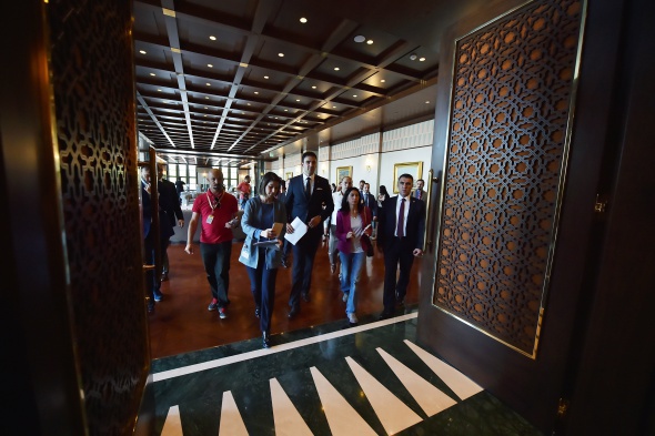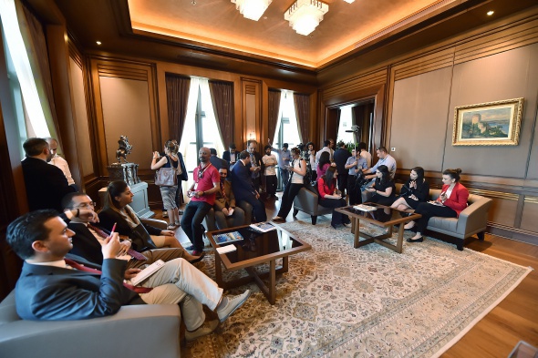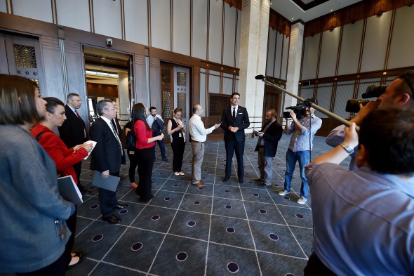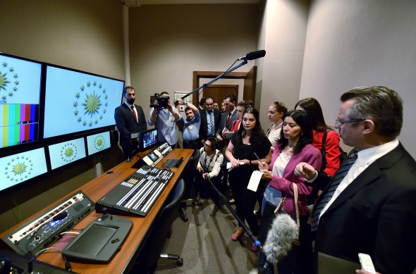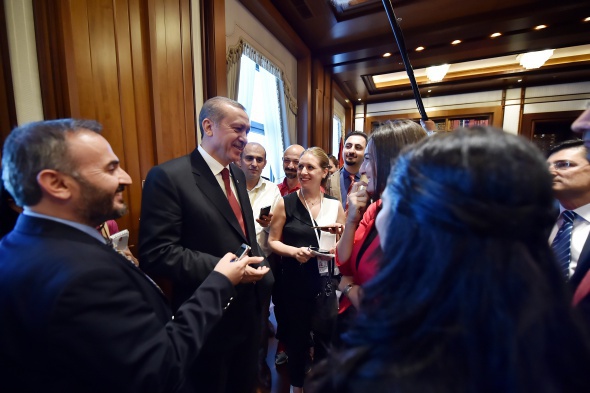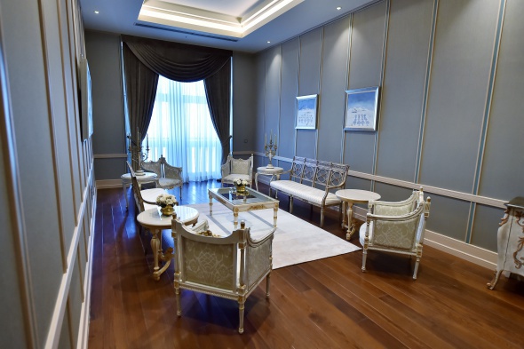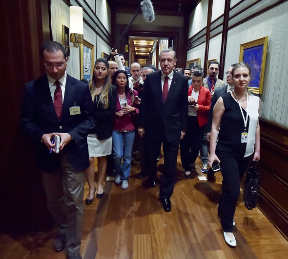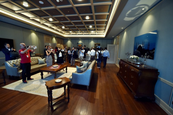 Daha önce basın mensuplarına açılan Cumhurbaşkanlığı Sarayı hizmet binalarının ardından bu kez Cumhurbaşkanı Tayyip Erdoğan’ın makamının bulunduğu Temsil Binası’nı tanıttı. Erdoğan ‘çalışma ofisi ve içinde bulunan kütüphaneyle ilgili ‘burası huzur bulduğu