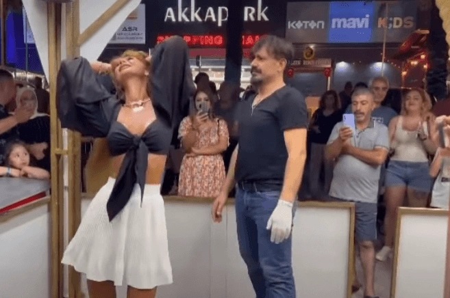 - Sarışın güzel, mini dar elbisesiyle diğer müşterileri kendine hayran bıraktı. O görüntüler sonrasında Çılgın Dondurmacı’nın da nutku tutuldu.