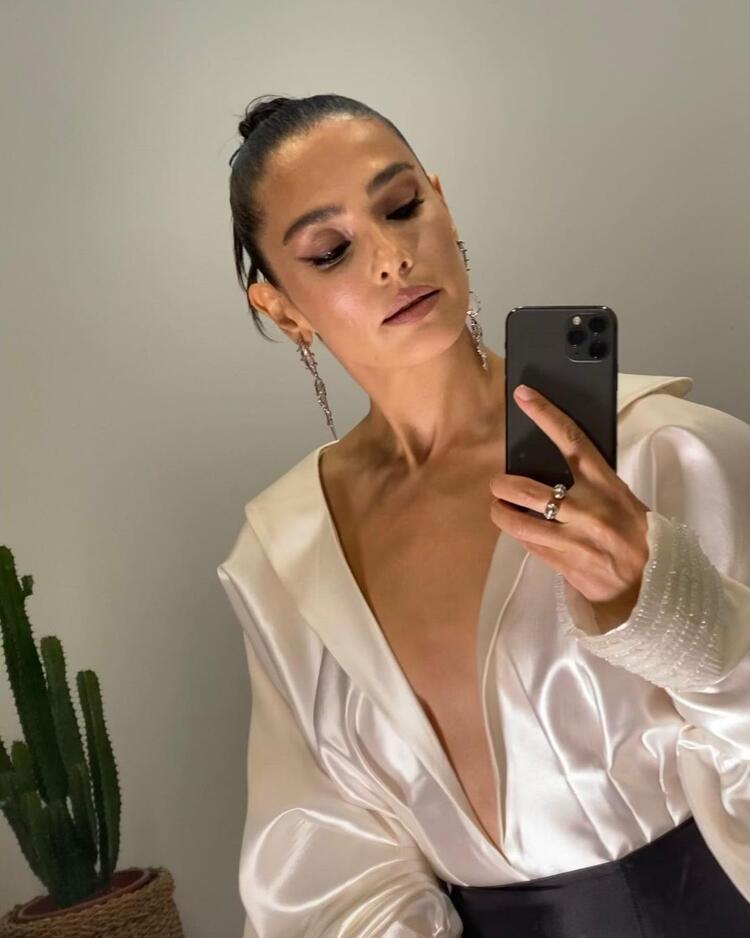 - Kombinini sıkı topuz ve kedi makyajıyla tamamlayan başarılı oyuncu, sadeliğini ön plana çıkardı. Dizilerde hep ezilen kadın rollerinde görmeye alıştığımız Eryiğit, görenleri şaşırttı.
