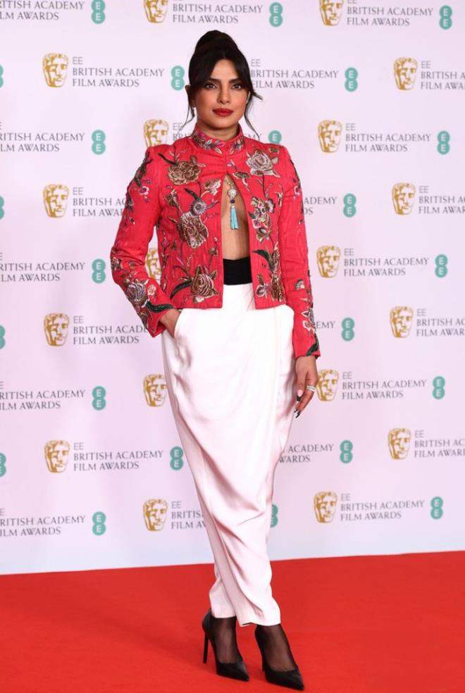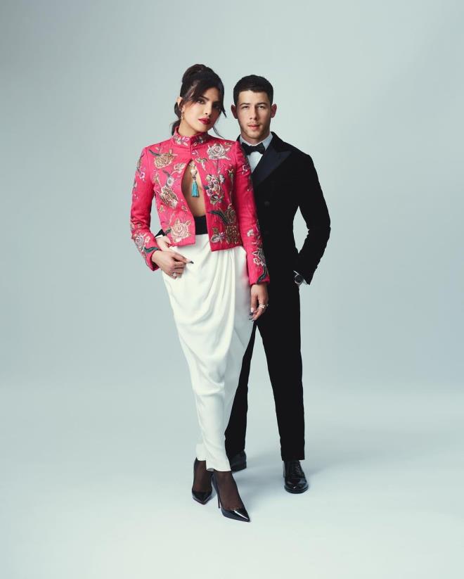 - Güzel isim kırmızı halıda Pertegaz imzalı beyaz pantolonlu, pembe çiçekli açık bir ceket, mavi püskül kolye ve siyah topuklu ayakkabılarla boy gösterdi. Kocası Nick Jonas, siyah bir smokin içinde ona eşlik etti.