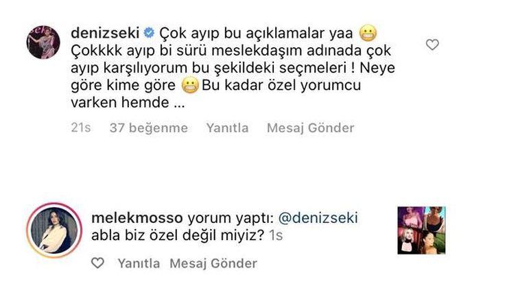 - Şarkıcı Deniz Seki, sanat dünyasıyla ilgili yapılan bir anket sonrası sosyal medya sayfasından tepki gösterdi. Meslektaşı Melek Mosso, Deniz Seki’ye yanıt verdi.