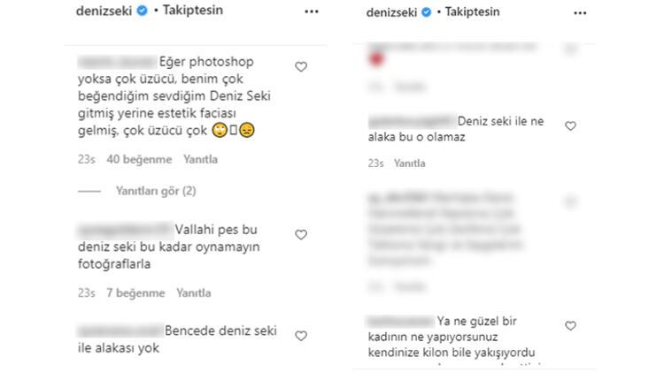 - “BU DENİZ SEKİ OLAMAZ” 9 bine yakın beğeni alan şarkıcının fotoğrafına, “Eğer photoshop yoksa çok üzücü, benim çok beğendiğim, sevdiğim Deniz Seki gitmiş yerine estetik faciası gelmiş, çok üzücü çok”, “Vallahi pes Deniz Seki, bu kadar oynamayın fotoğraflarla”, “Deniz seki ile ne alaka, bu o olamaz” gibi 200’den fazla yorum yapıldı.