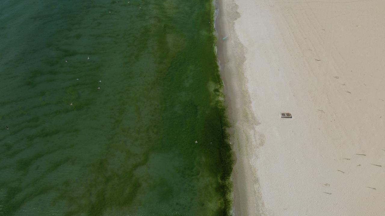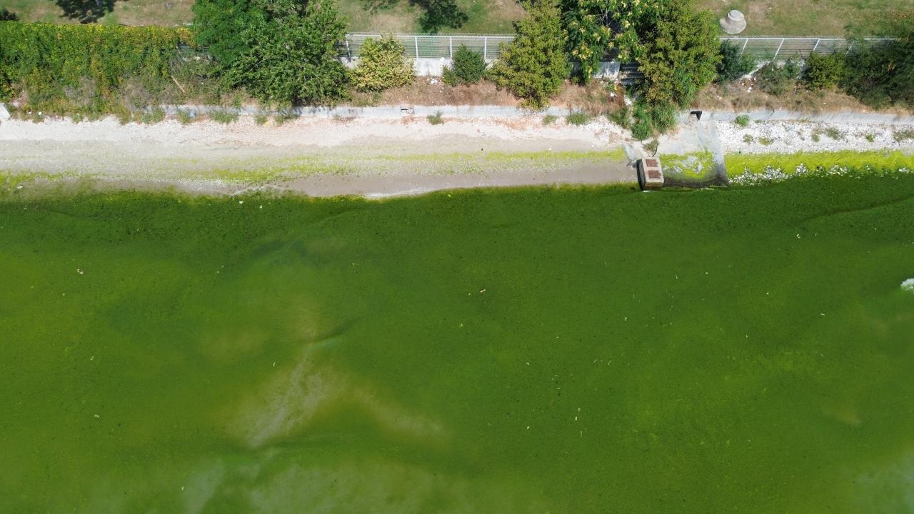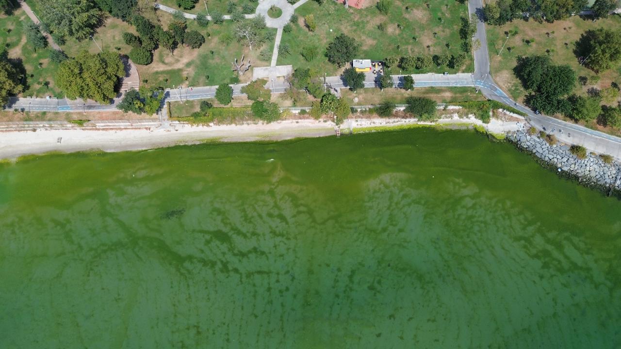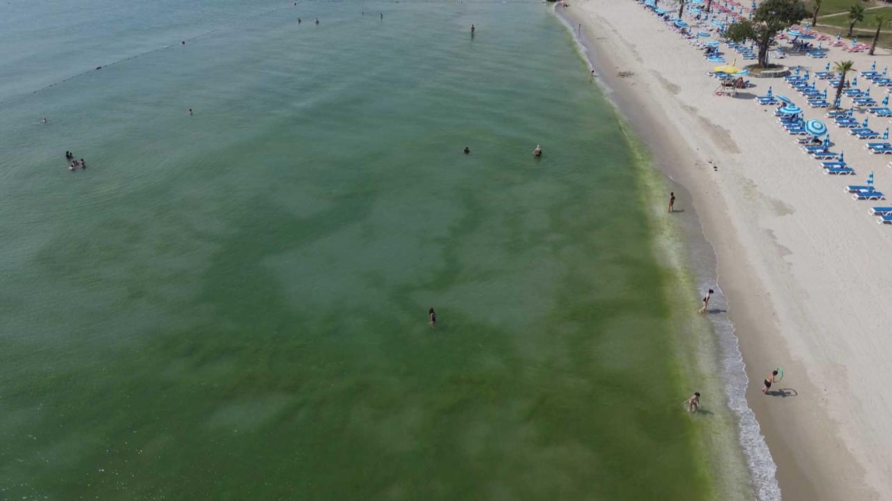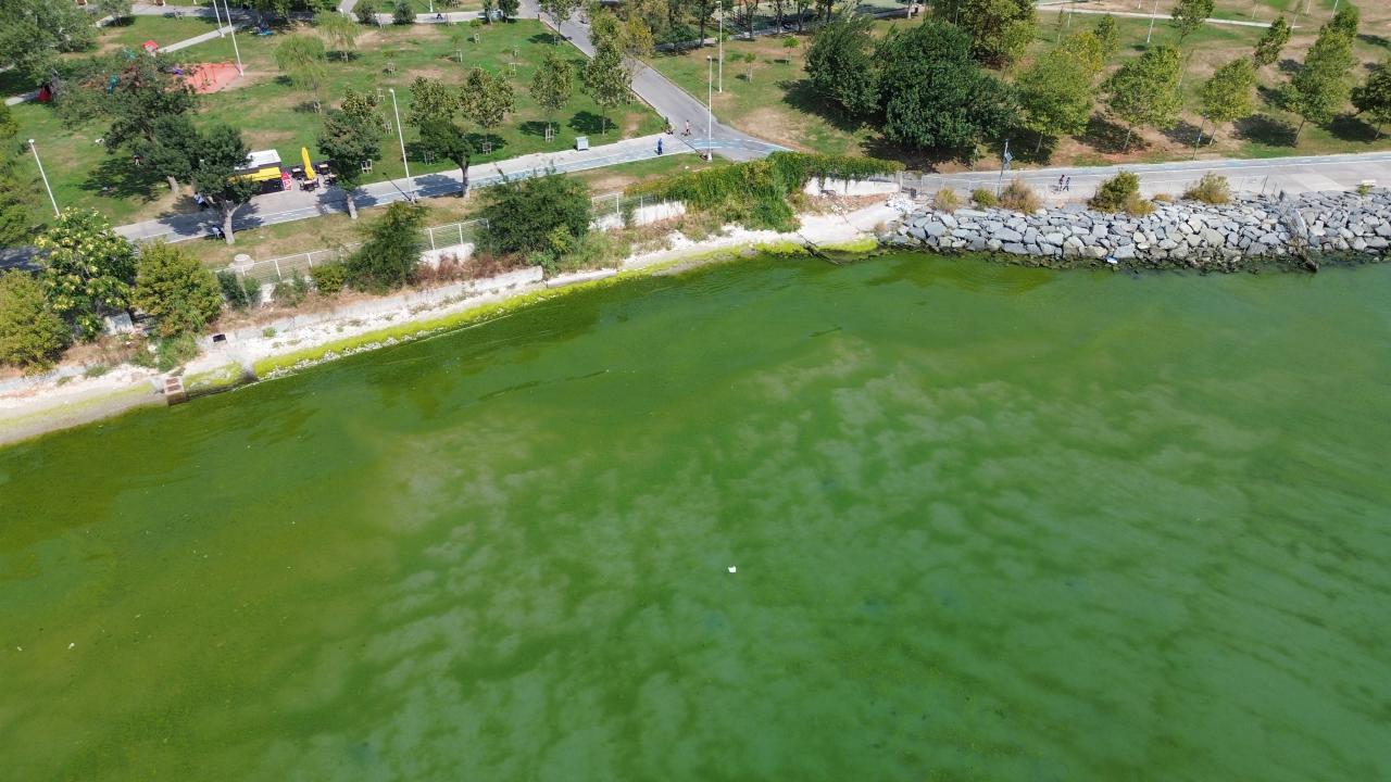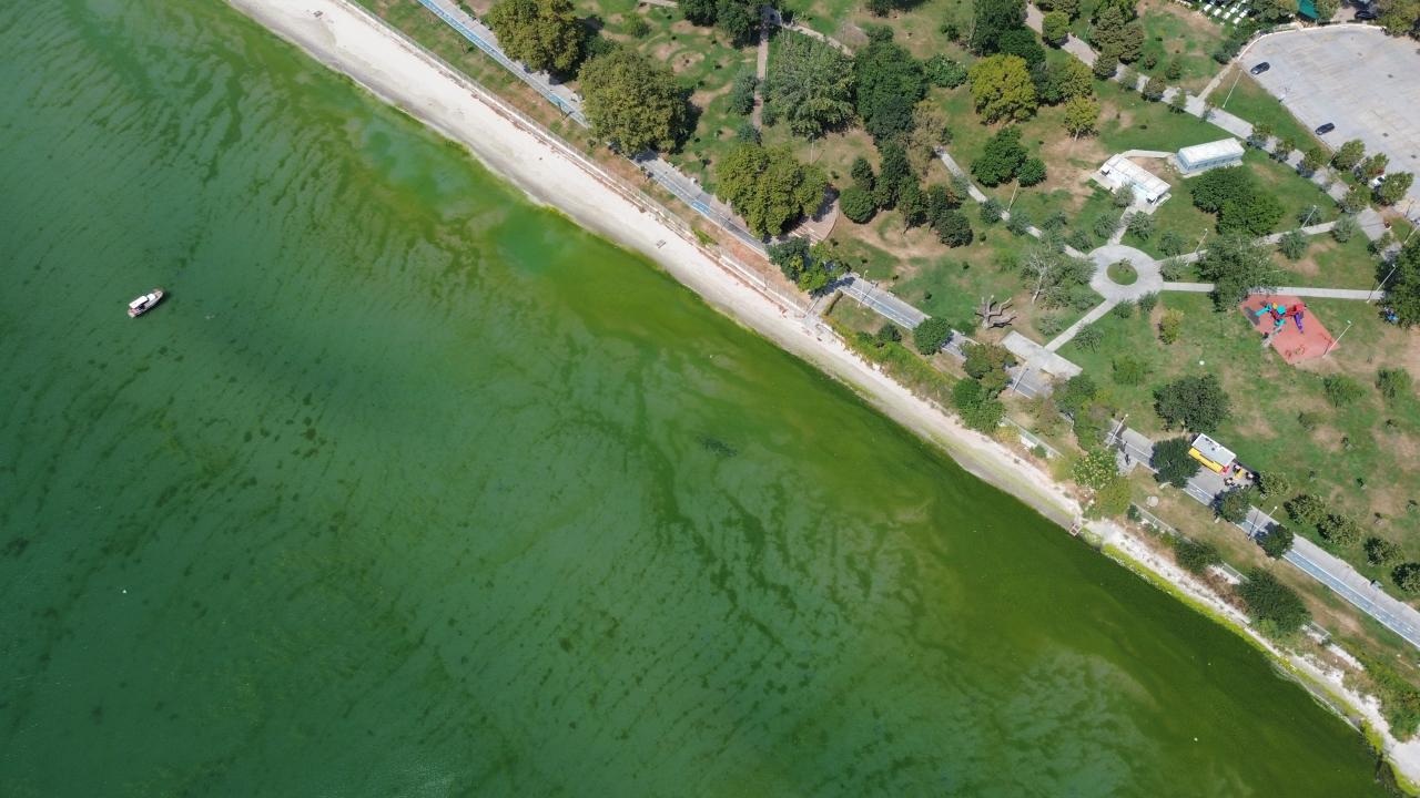 - Havadan görüntülenen sahilin yeşile büründüğü ancak yanında bulunan işletmedeki vatandaşların buna aldırış etmeden denize girdikleri görüldü.