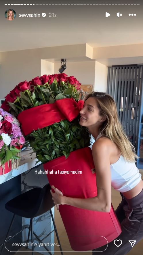 - Güllerini sosyal medyada paylaşan Şevval Şahin, paylaşımına, “Bacak boyum kadar olmazsa olmaz. Aşkım, seni çok seviyorum” notunu yazdı. Devasa gül buketini ağırlığından dolayı taşıyamayan Şevval Şahin o anları sosyal medya hesabından paylaşmayı ihmal etmedi.