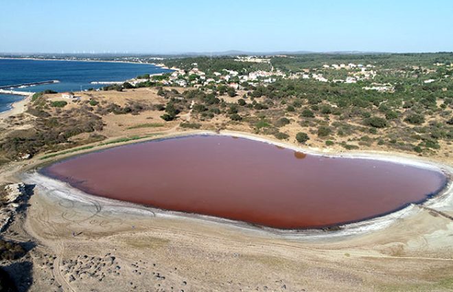 - Çanakkale’nin Ezine ilçesine bağlı Dalyan köyündeki Alexandria Troas Antik Kenti’nin 2 bin yıllık iç limanı, zamanla denizle bağlantısı kesilince bir göle dönüştü. Ardından da doğa koşullarına bağlı olarak kalp şeklini aldı. İçerisindeki tuzlu su da yılın belli dönemlerinde pembe renge dönüşünce ortaya kalpli pembe göl çıktı.