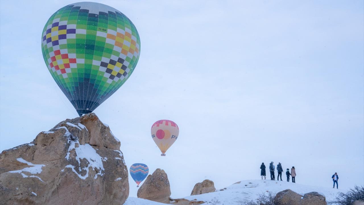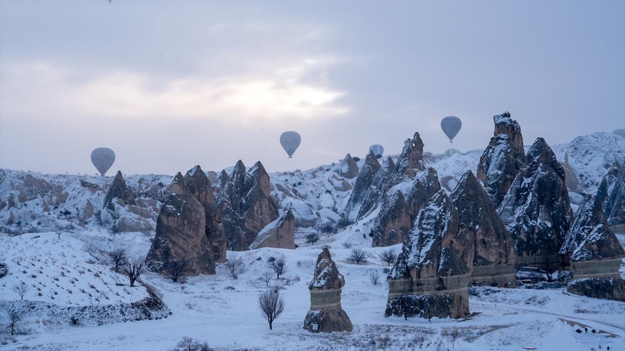 - Türkiye’nin dört mevsim tatil rotalarından biri olan Nevşehir’in Kapadokya bölgesinde sıcak hava balonları, karla kaplanan peribacalarının üzerinde uçtu.