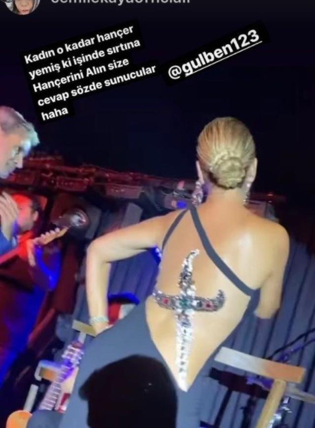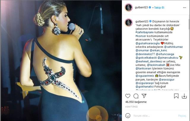 - “SIRTIMDAN HANÇERLEYENLERE GELSİN” Konser sırasında kostümü ile ilgili açıklama da yapan Gülben Ergen, “Sırtımdan hançerleyenlere gelsin” diyerek imalı bir açıklamada bulundu.