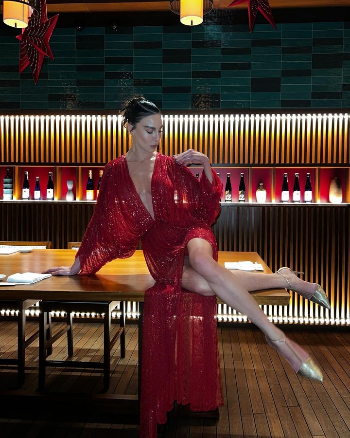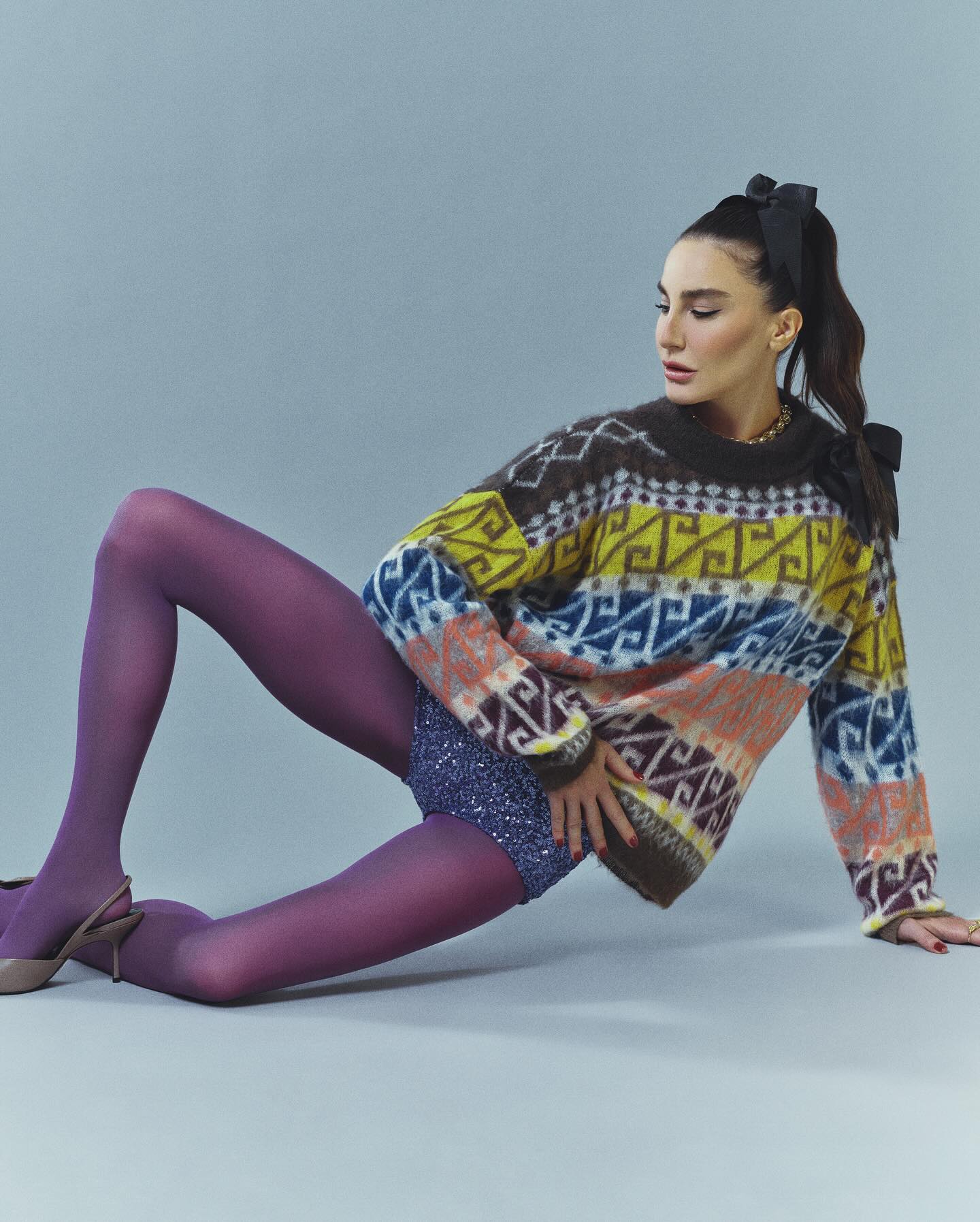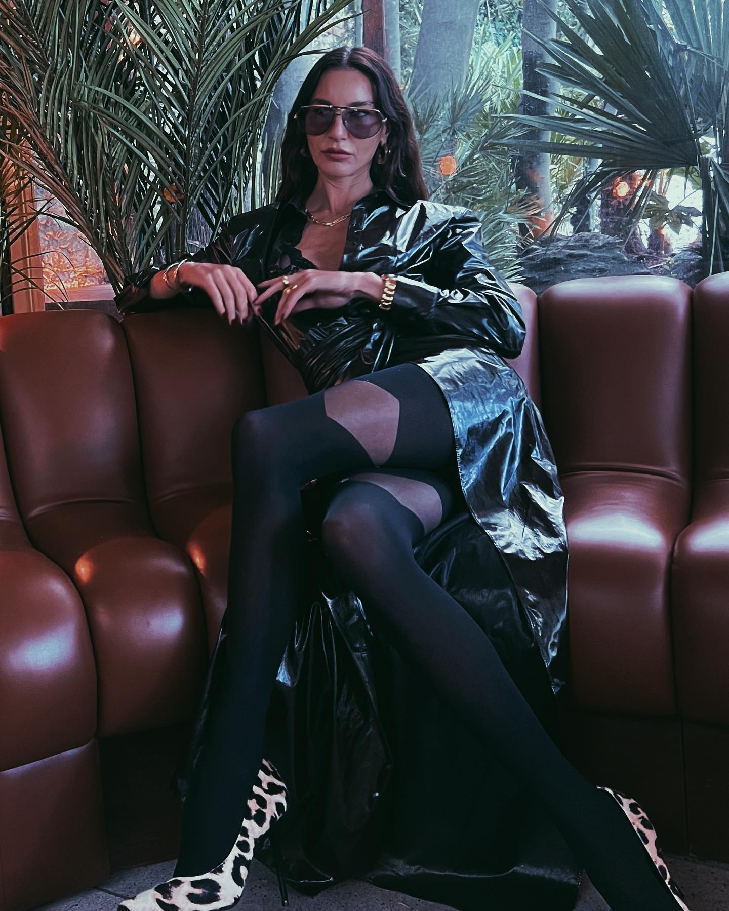 - Siyah bir mayo giydi. Uzanarak yatak üzerinde poz verdi.