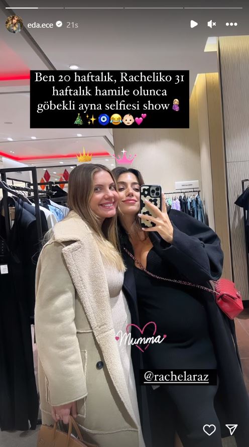 - Ayna karşısına karınlarını göstererek verdiği pozu yayınlayan Ece, “Ben 20 haftalık, Racheliko 31 haftalık hamile olunca göbekli ayna selfiesi” notunu yazdı.