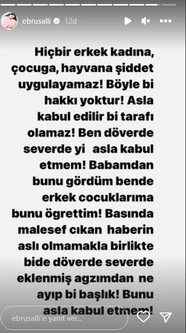 - Ebru Şallı isyan etti… Ebru Şallı, eşinden şiddet gördüğü iddialarına Instagram’dan cevap verdi. “Bu kadarı ayıp artık” diyen Şallı, iddiaları reddetti. Ünlü manken “Neden yaptığımiz nice güzel işler var onları haber yapmıyorsunuz?” diyerek isyan etti.(tv100)