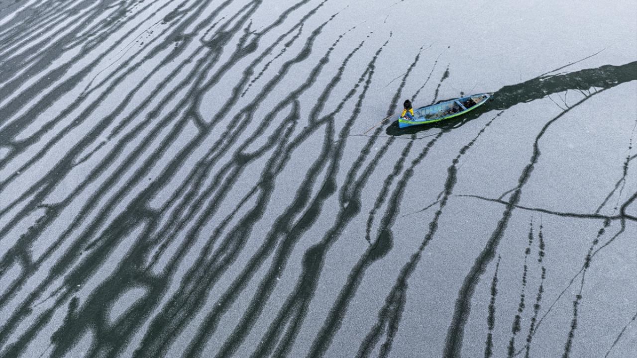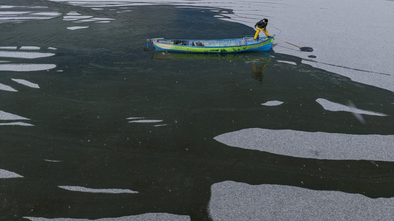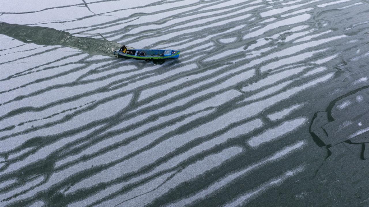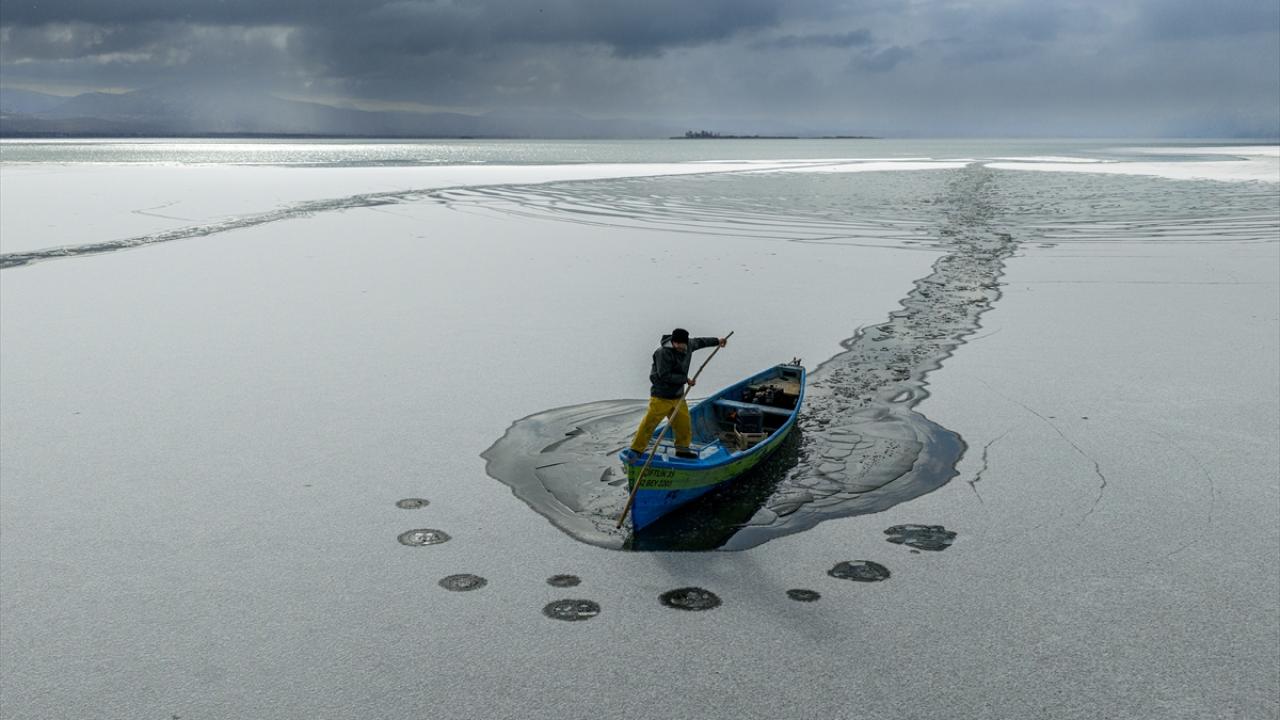 - Geçimlerini balıkçılıkla sağlayan göl balıkçıları, zorlu kış koşullarına rağmen avlanmayı sürdürebilmek için buz tutan göl yüzeyini kırarak tekneleriyle suya açıldı.