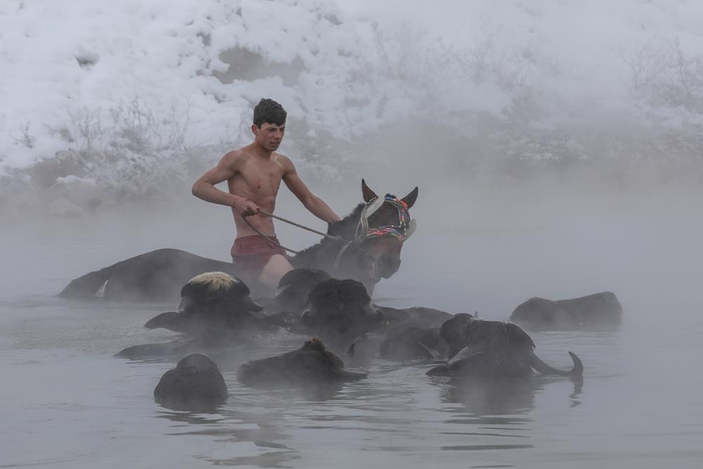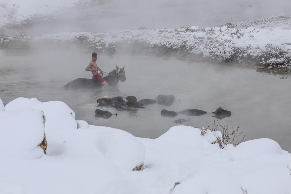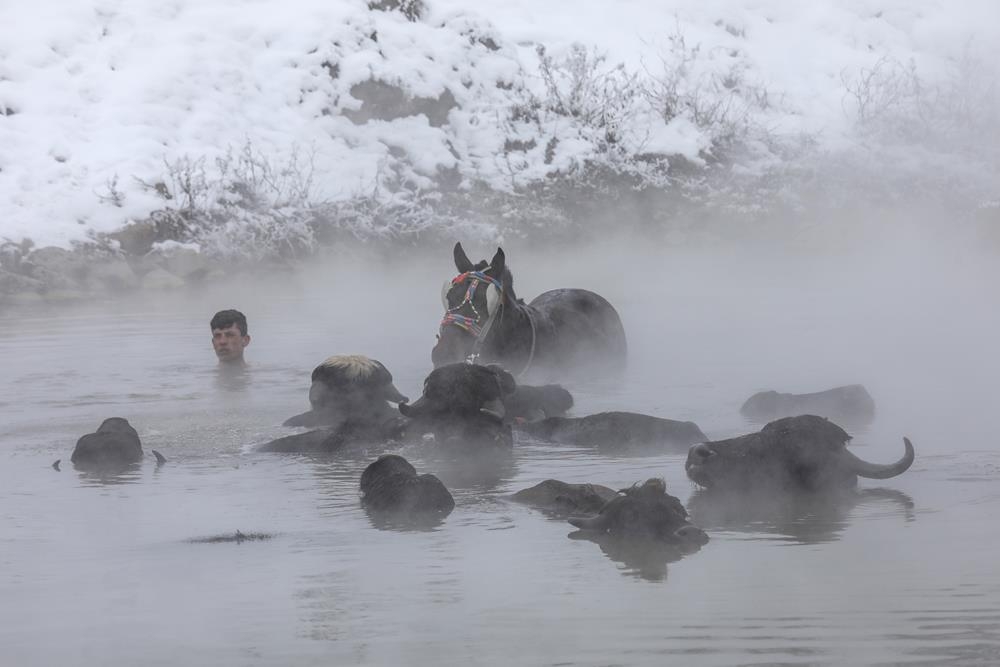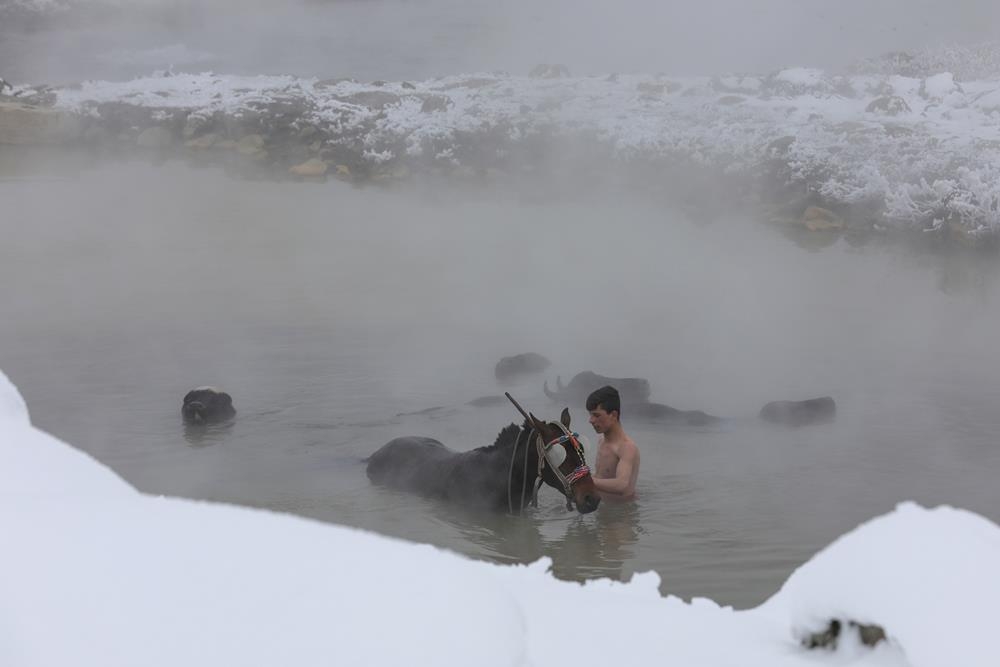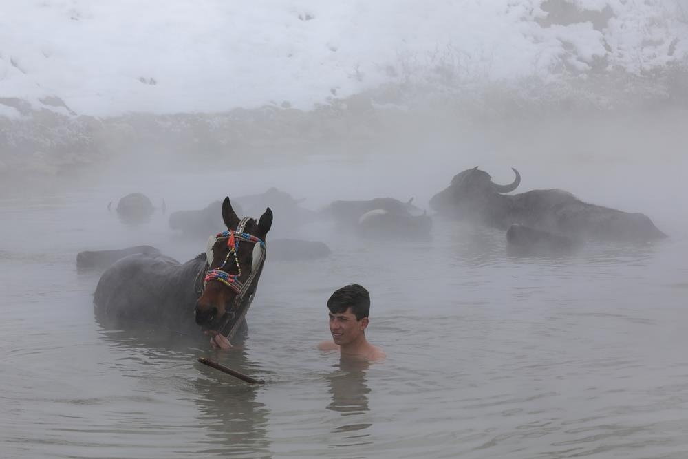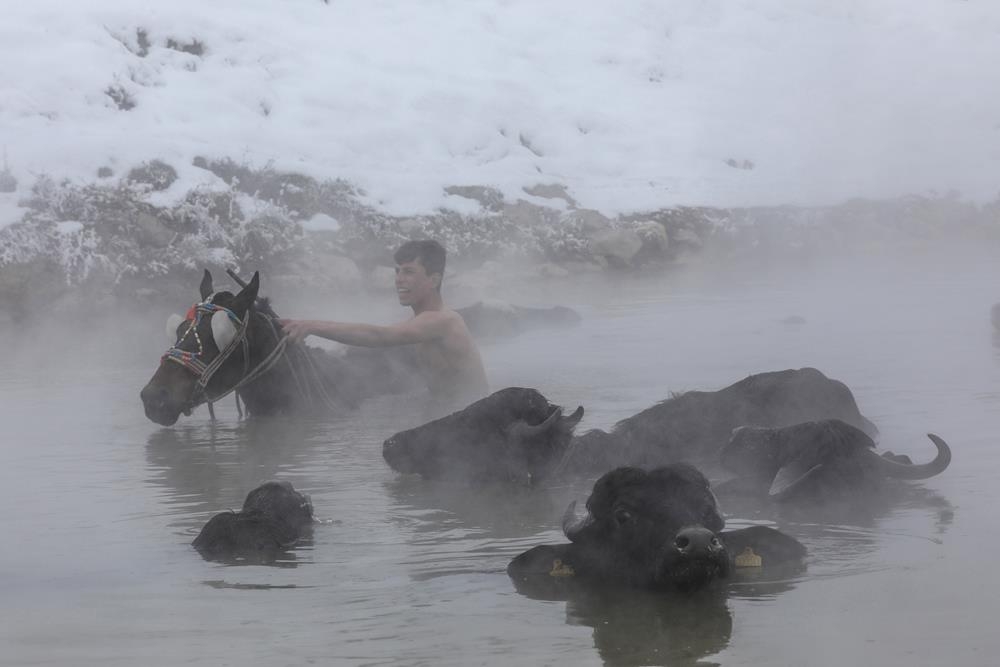 Bitlis Güroymak’a bağlı Budaklı köyünde kışın ahırlarda kalan manda ve atlar, belli aralıklarla götürüldükleri kaplıcada temizleniyor. Çevresi karla kaplı kaplıcanın sıcak suyunda uzun bir süre bekletilen manda ve atlar, fotoğraf tutkunlarının da ilgisini çekiyor.