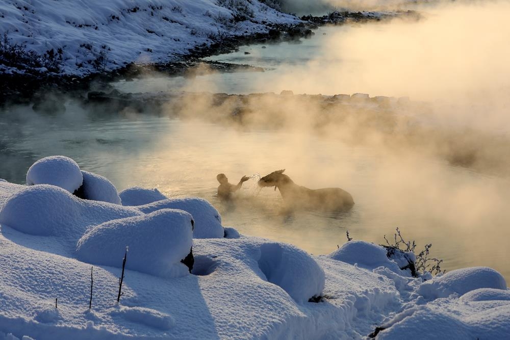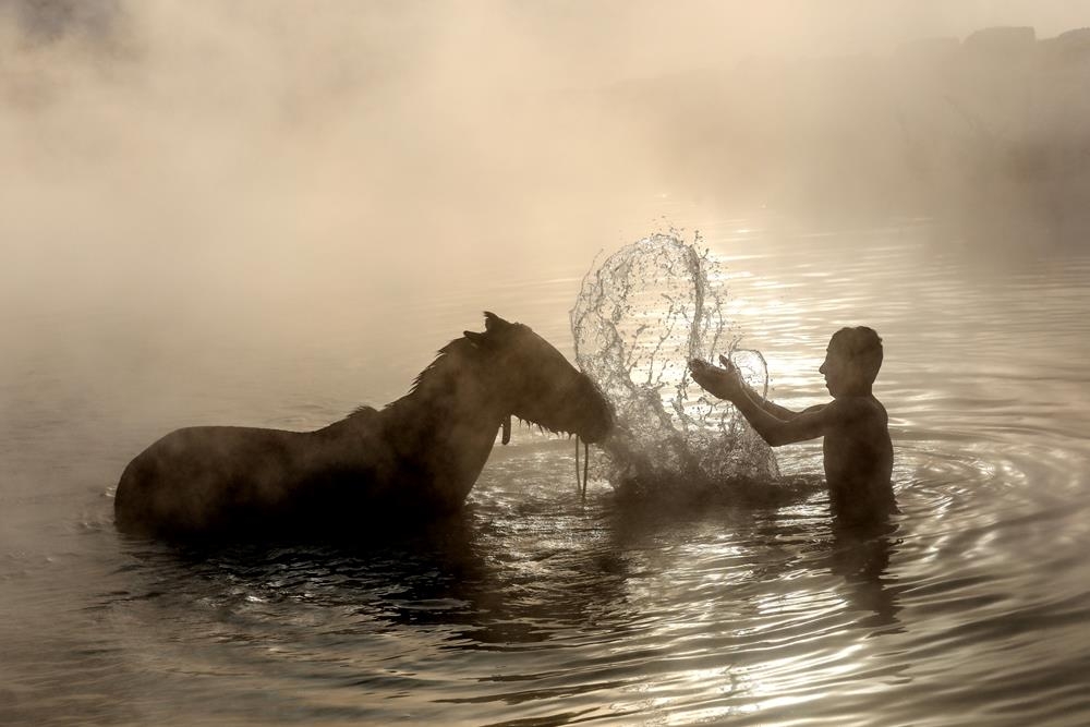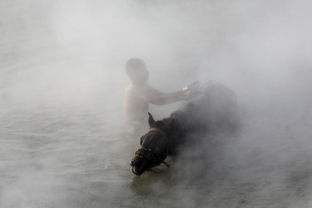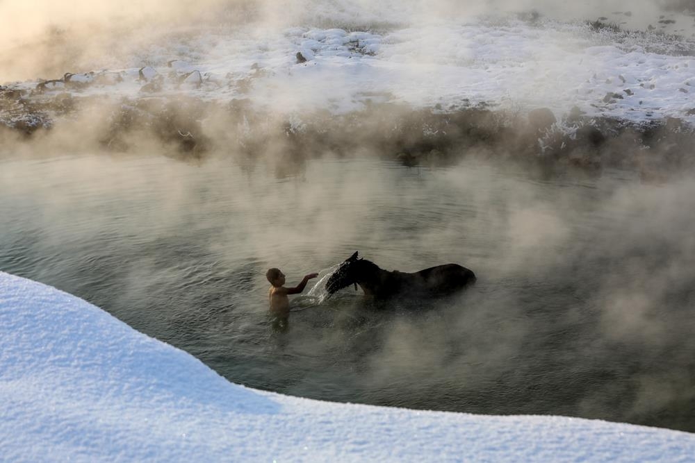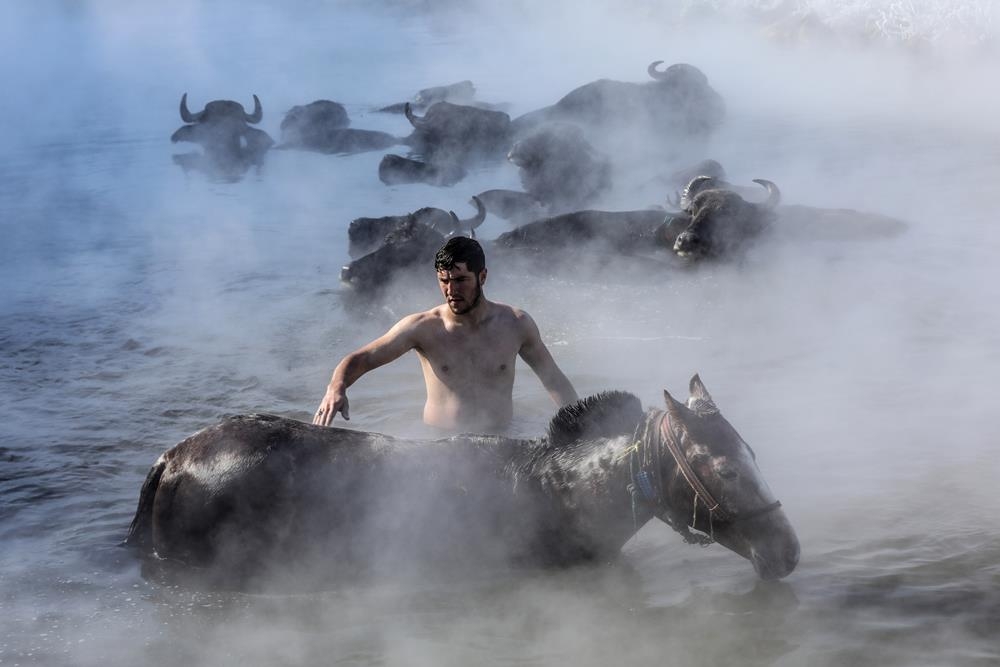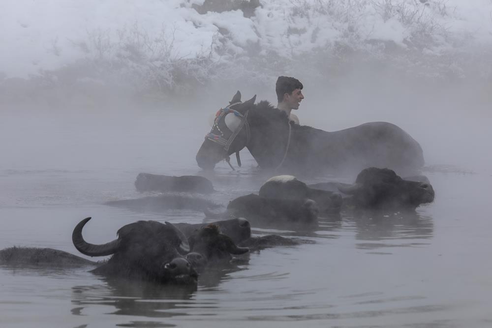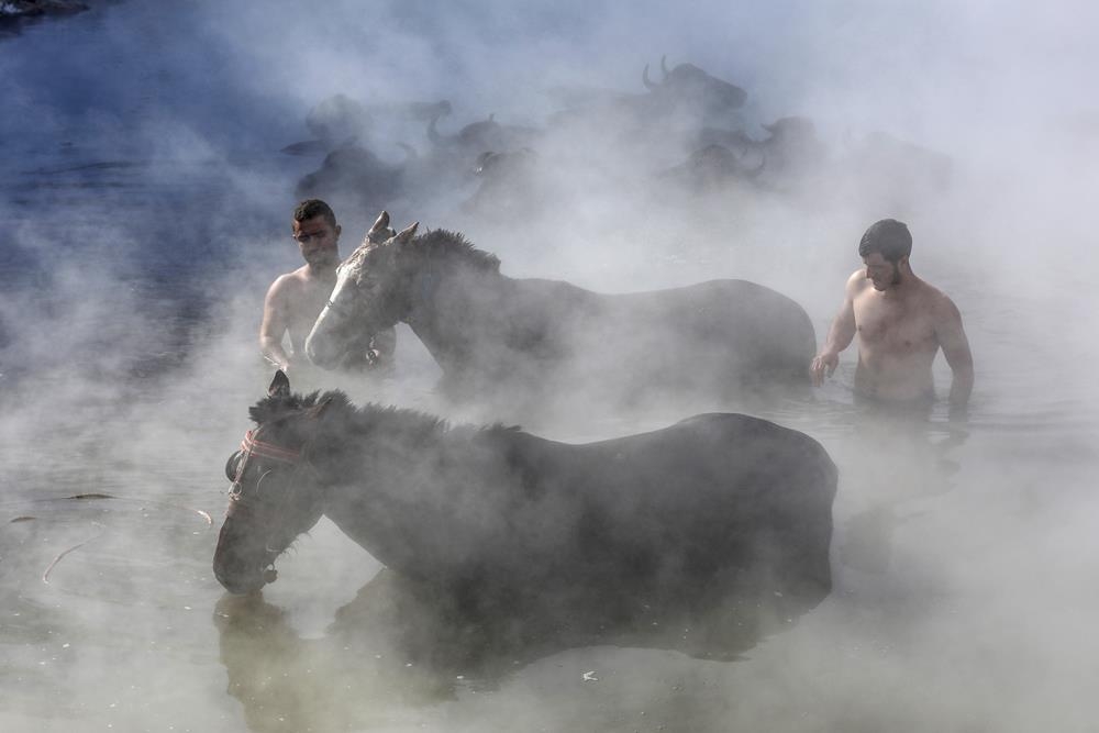 Bitlis Güroymak’a bağlı Budaklı köyünde kışın ahırlarda kalan manda ve atlar, belli aralıklarla götürüldükleri kaplıcada temizleniyor. Çevresi karla kaplı kaplıcanın sıcak suyunda uzun bir süre bekletilen manda ve atlar, fotoğraf tutkunlarının da ilgisini çekiyor.