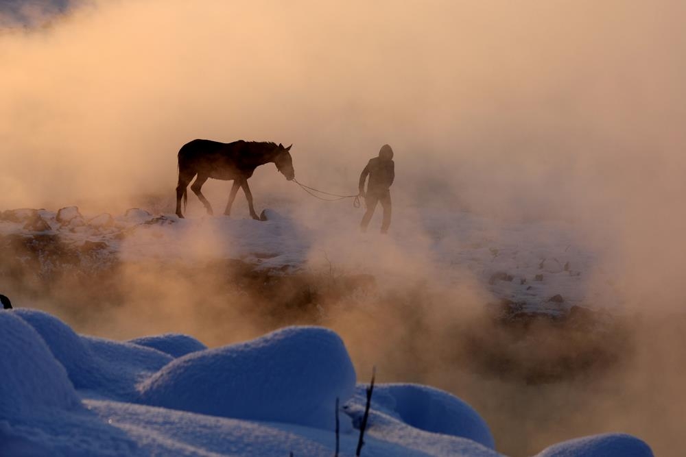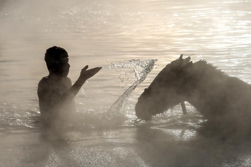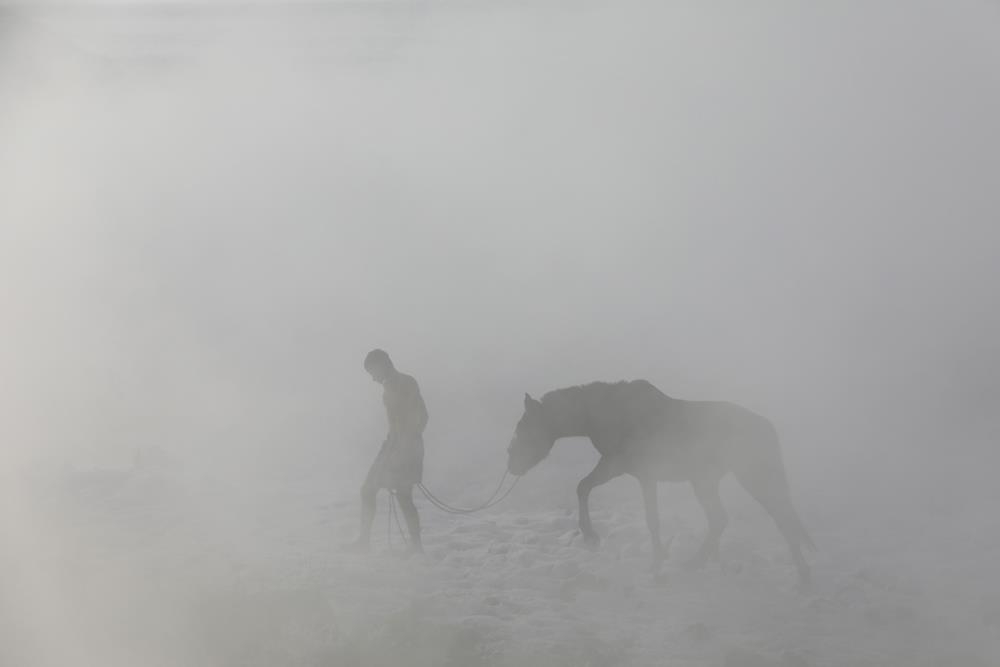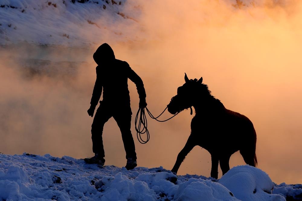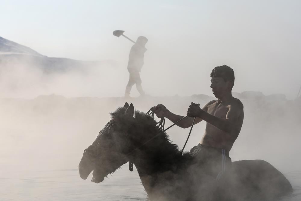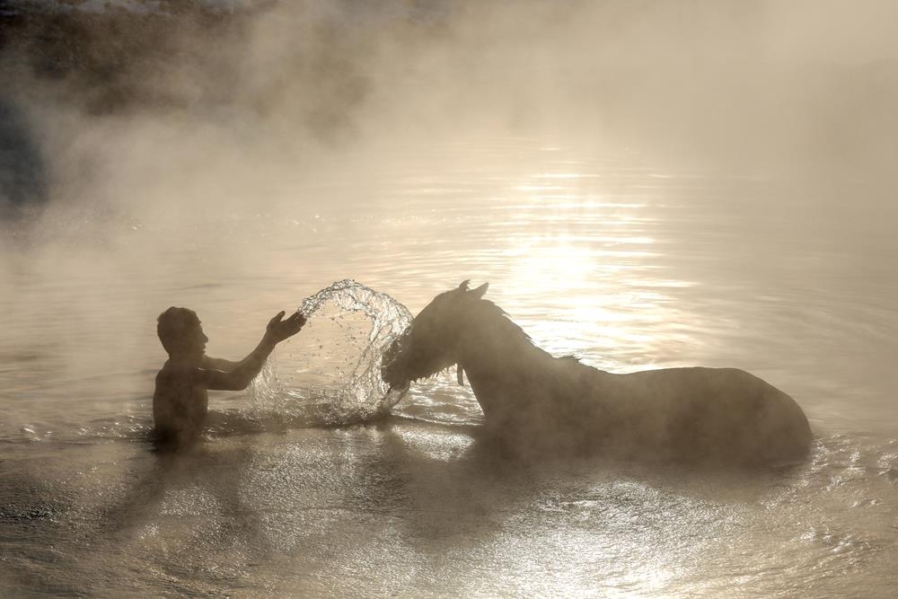 Bitlis Güroymak’a bağlı Budaklı köyünde kışın ahırlarda kalan manda ve atlar, belli aralıklarla götürüldükleri kaplıcada temizleniyor. Çevresi karla kaplı kaplıcanın sıcak suyunda uzun bir süre bekletilen manda ve atlar, fotoğraf tutkunlarının da ilgisini çekiyor.