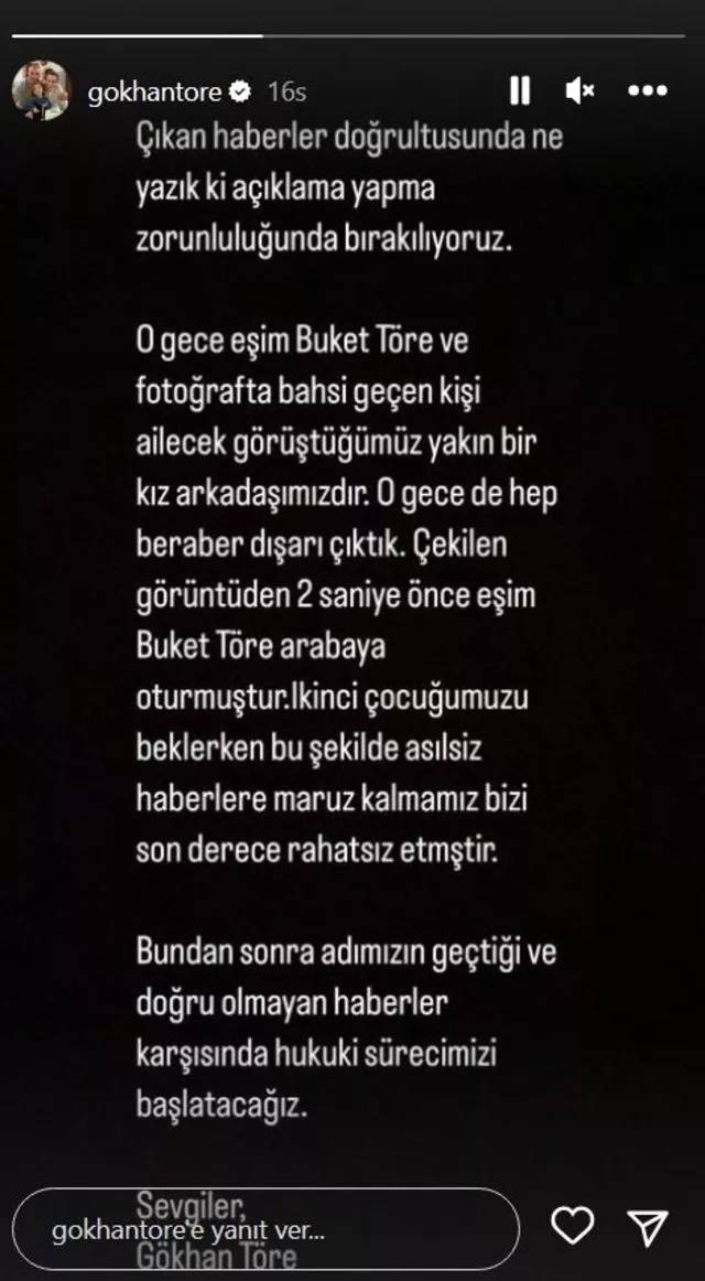 - BUKET TÖRE İKİNCİ KEZ HAMİLE… “O gece eşim Buket Töre ve fotoğrafta bahsi geçen kişi ailecek görüştüğümüz yakın bir kız arkadaşımızdır. O gece de hep beraber dışarı çıktık. Çekilen görüntüden 2 saniye önce eşim Buket Töre arabaya oturmuştur. İkinci çocuğumuzu beklerken bu şekilde asılsız haberlere maruz kalmamız bizi son derece rahatsız etmiştir. Bundan sonra adımızın geçtiği ve doğru olmayan haberler karşısında hukuki sürecimizi başlatacağız.”(mynet.com)