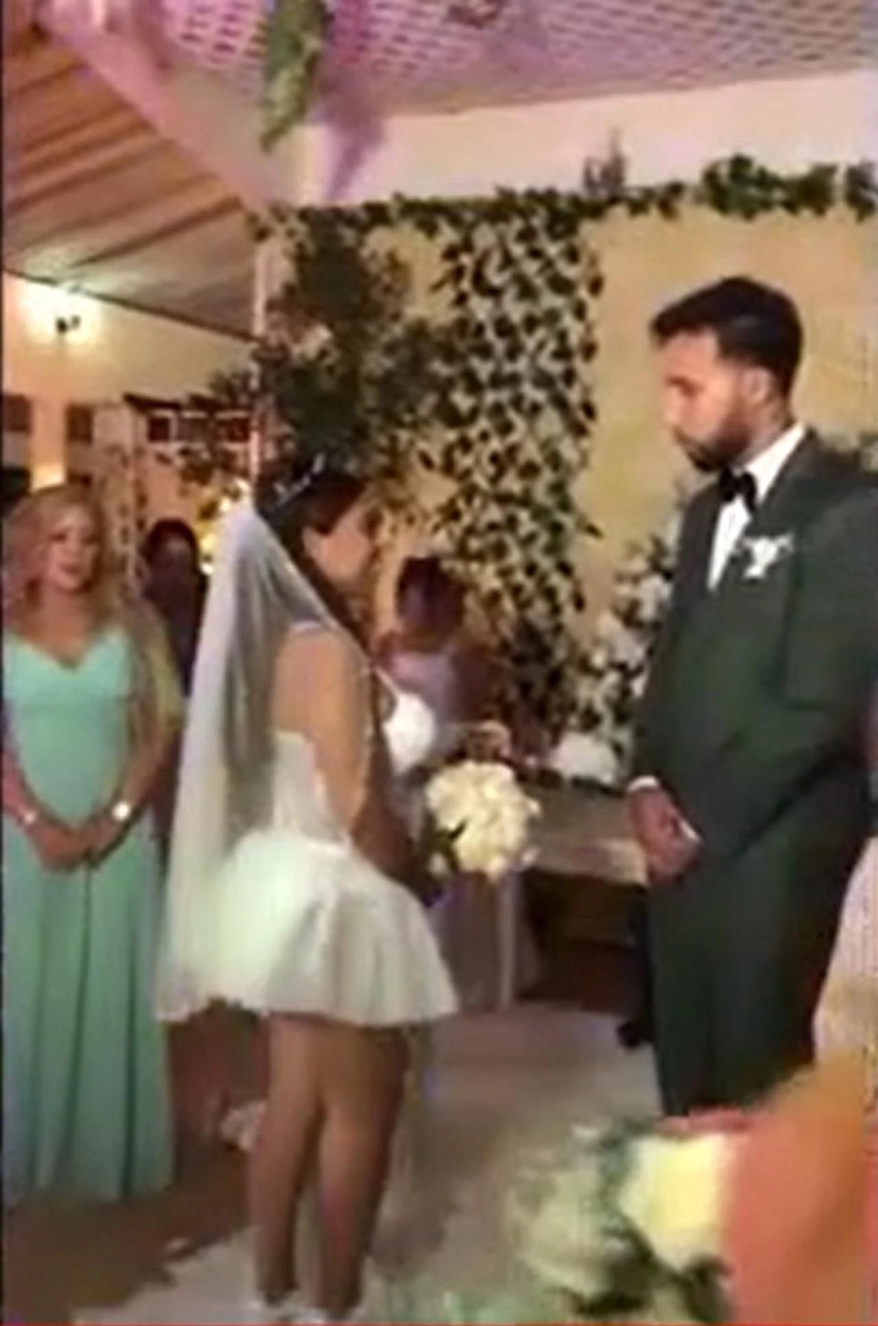 - Dekolteli ve kısacık bir gelinlik tercih eden gelin, müziğin ve alkışların arasında salona girdi.