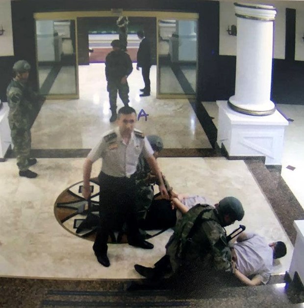 - 15 Temmuz gecesi Genelkurmay İkinci Başkanı Orgeneral Yaşar Güler(Ortada) darbeci askerler tarafından böyle götürüldü. Elleri arkadan bağlanarak komutan katına çıkarıldı. Güler götürülürken yerde Kara Kuvvetleri Kurmay Başkanı Orgeneral İhsan Uyar(Yerde Kapıya yakın) elleri arkadan bağlandı.