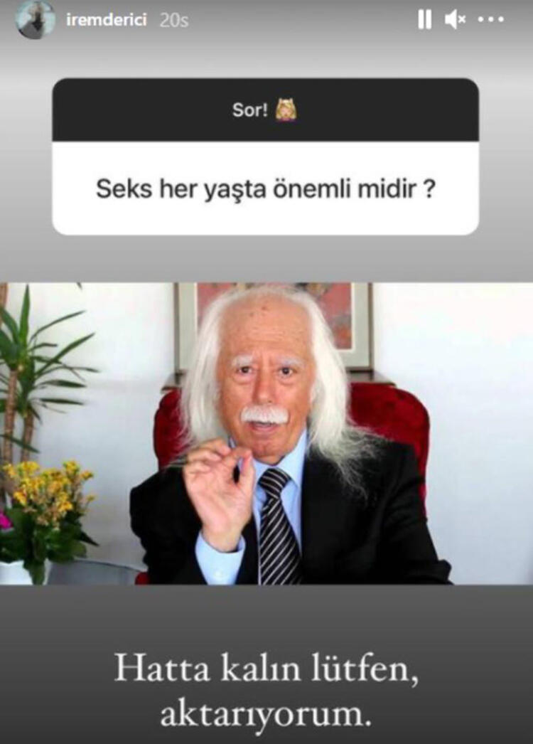 - HAYDAR DÜMEN’Lİ CEVAP! Instagram hesabı üzerinden takipçilerinin yönelttiği soruları yanıtlayan sivri dilli şarkıcı İrem Derici, yine çok konuşulacak açıklamalar yapmış, “Cinsellik her yaşta önemli midir?” diyen takipçisine, Dr. Haydar Dümen’in fotoğrafını paylaşarak cevap vermesi dikkat çekmişti.
