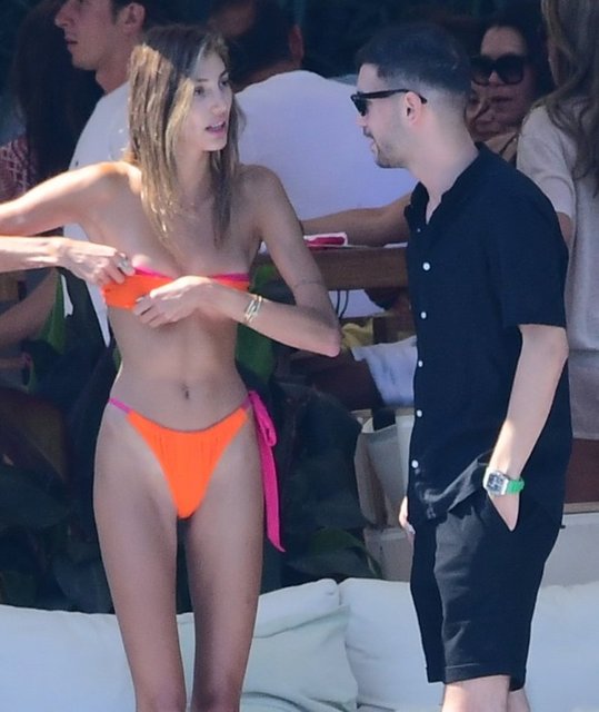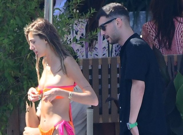 - Pembe ve turuncu renkli iddialı bir bikini giydiği görülen Şahin, gizemli erkek ile kısa bir süre sohbet etmesinin ardından denize girmeyi tercih etti.