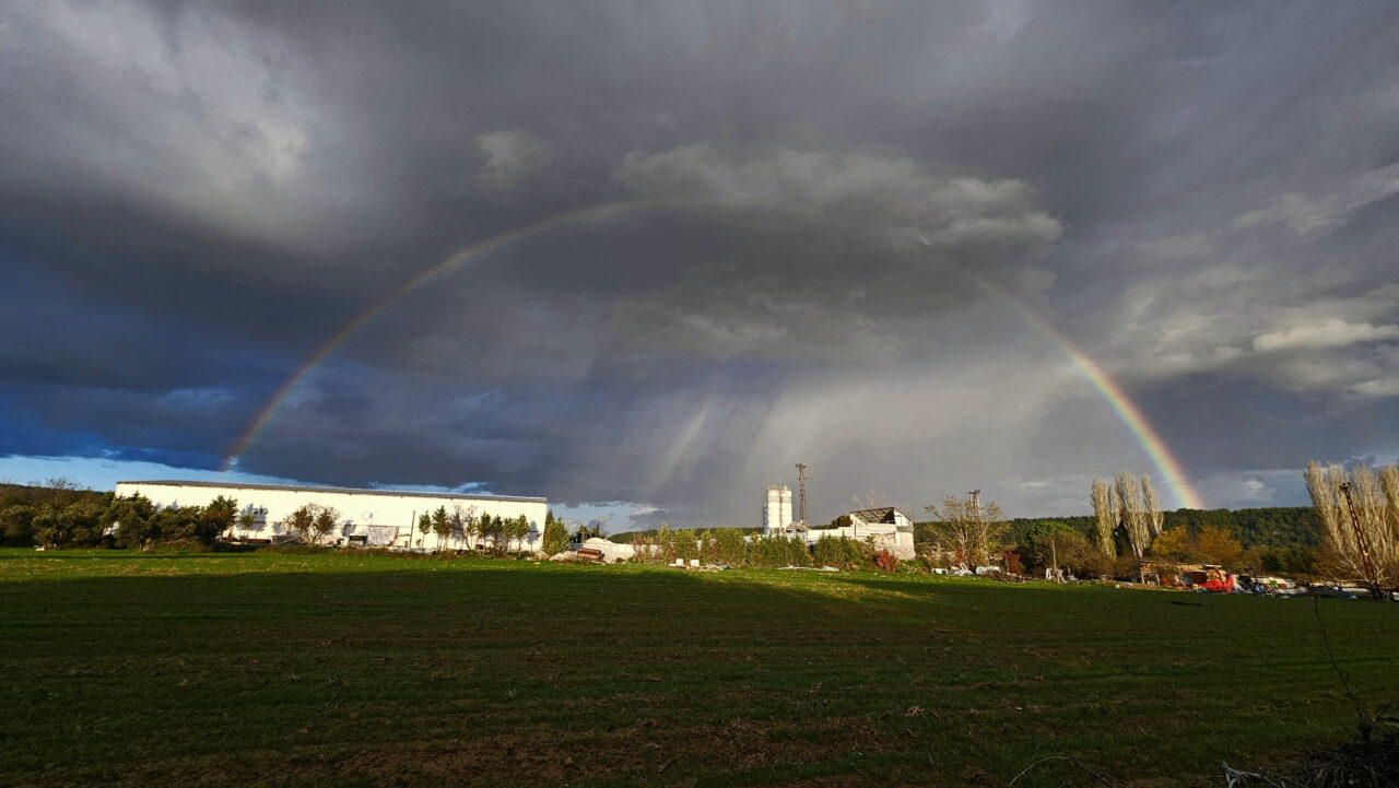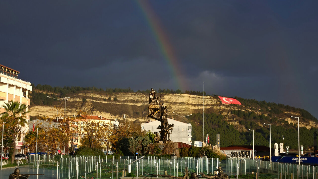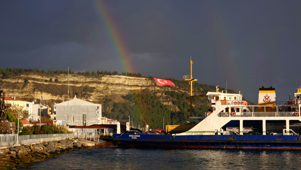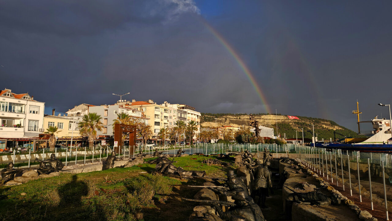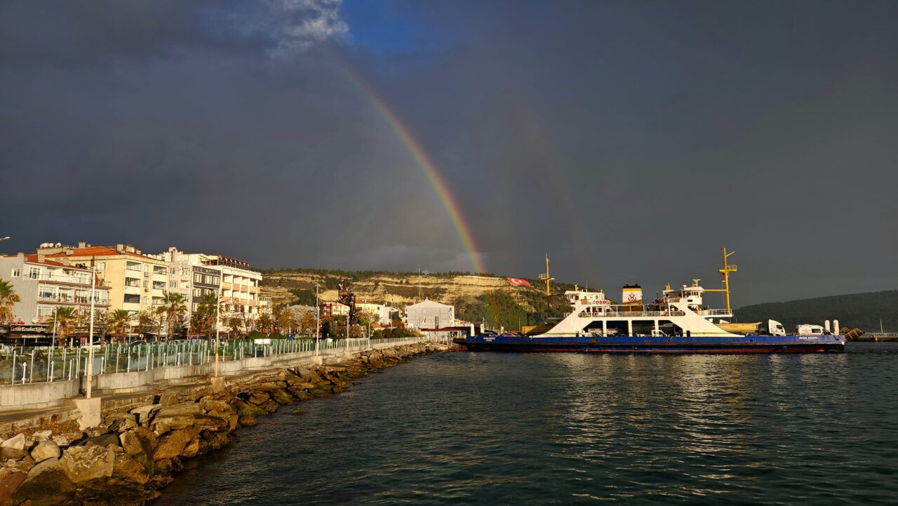 Gökkuşağını hiç böyle gördünüz mü? Çanakkale’nin Eceabat ilçesinde yağmurun ardından ortaya çıkan gökkuşağı, güzel görüntü oluşturdu.