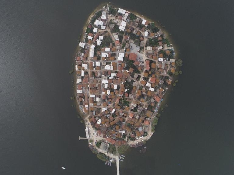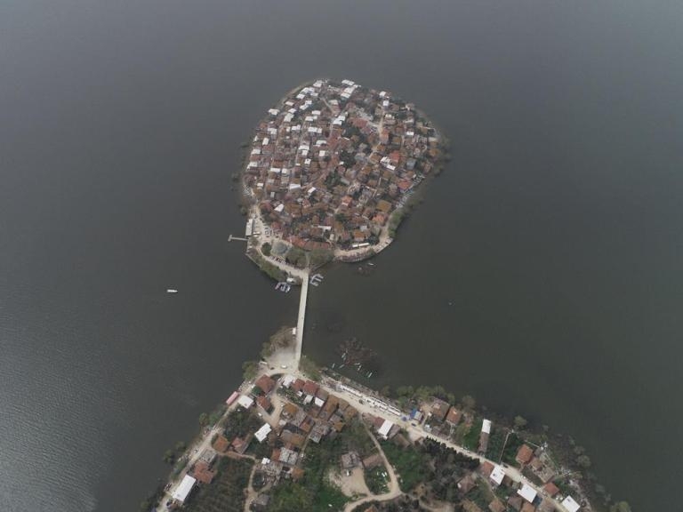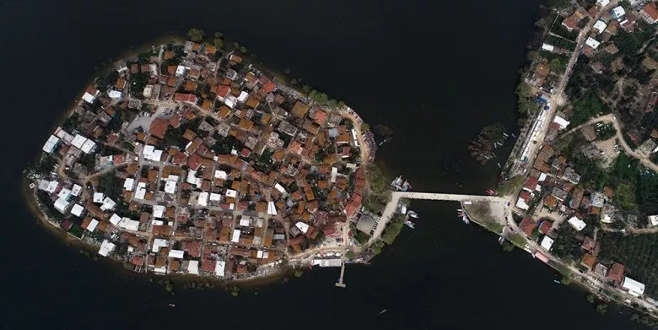 Fotoğrafta Uluabat Gölü kıyısındaki Gölyazı köyü görülüyor.