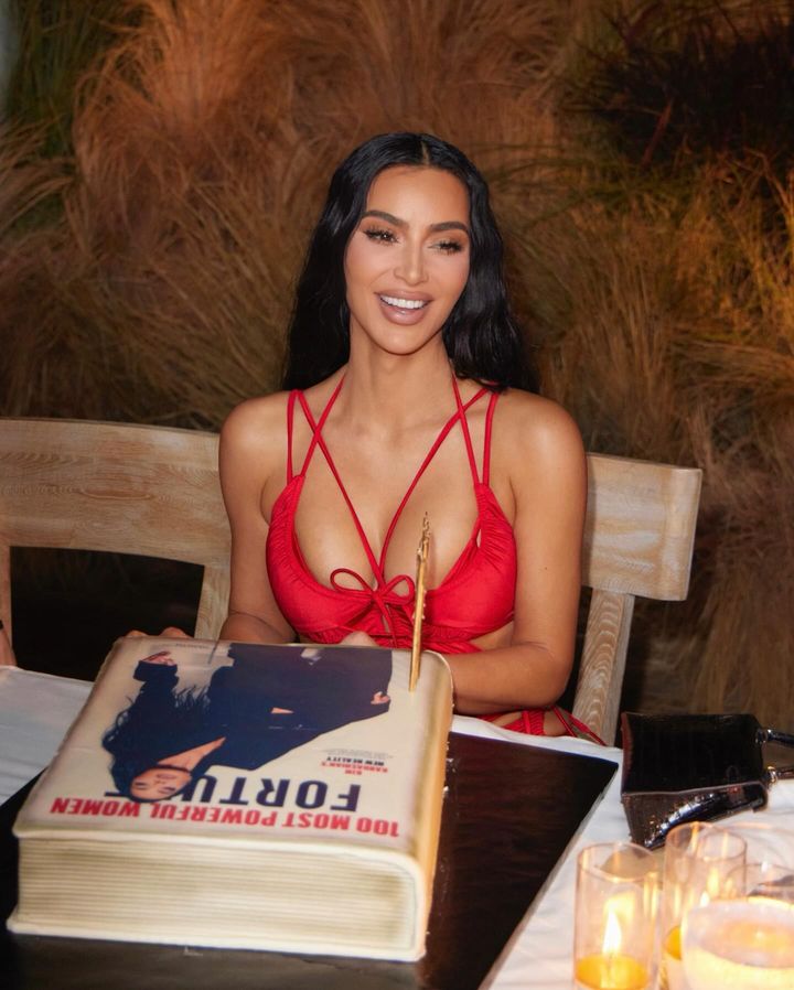 - Kardashian’ın kırmızı bir elbise giymeyi tercih ettiği partide, doğum günü pastası da ilginçti. Pasta, Fortune dergisinin Kardashian’ı “Dünyanın En Güçlü 100 Kadını” listesine alışını hatırlattı.