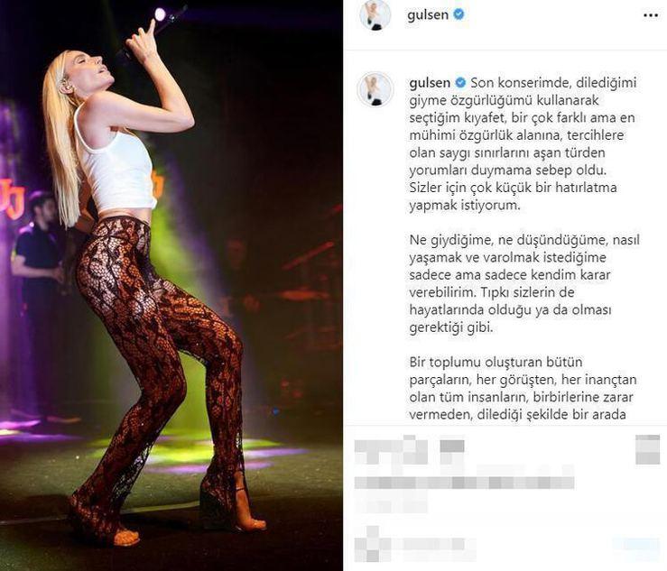 - Sahnede giydiği transparan kıyafet tartışmalara neden olan Gülşen, ilk kez konuştu. İç çamaşırının üzerine transparan giyen şarkıcı, Instagram’dan ateş püskürdü.
